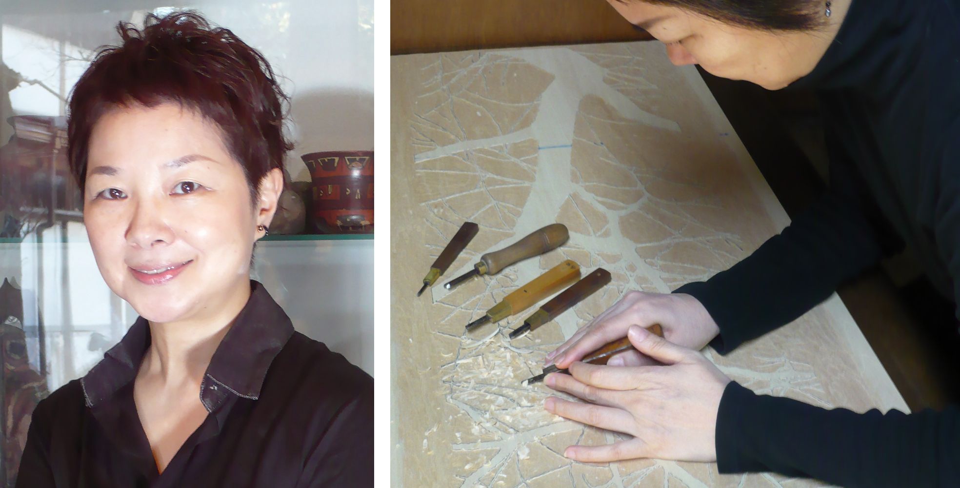(left) Renowned artist Ayomi Yoshida.(right) Carving the block to be printed