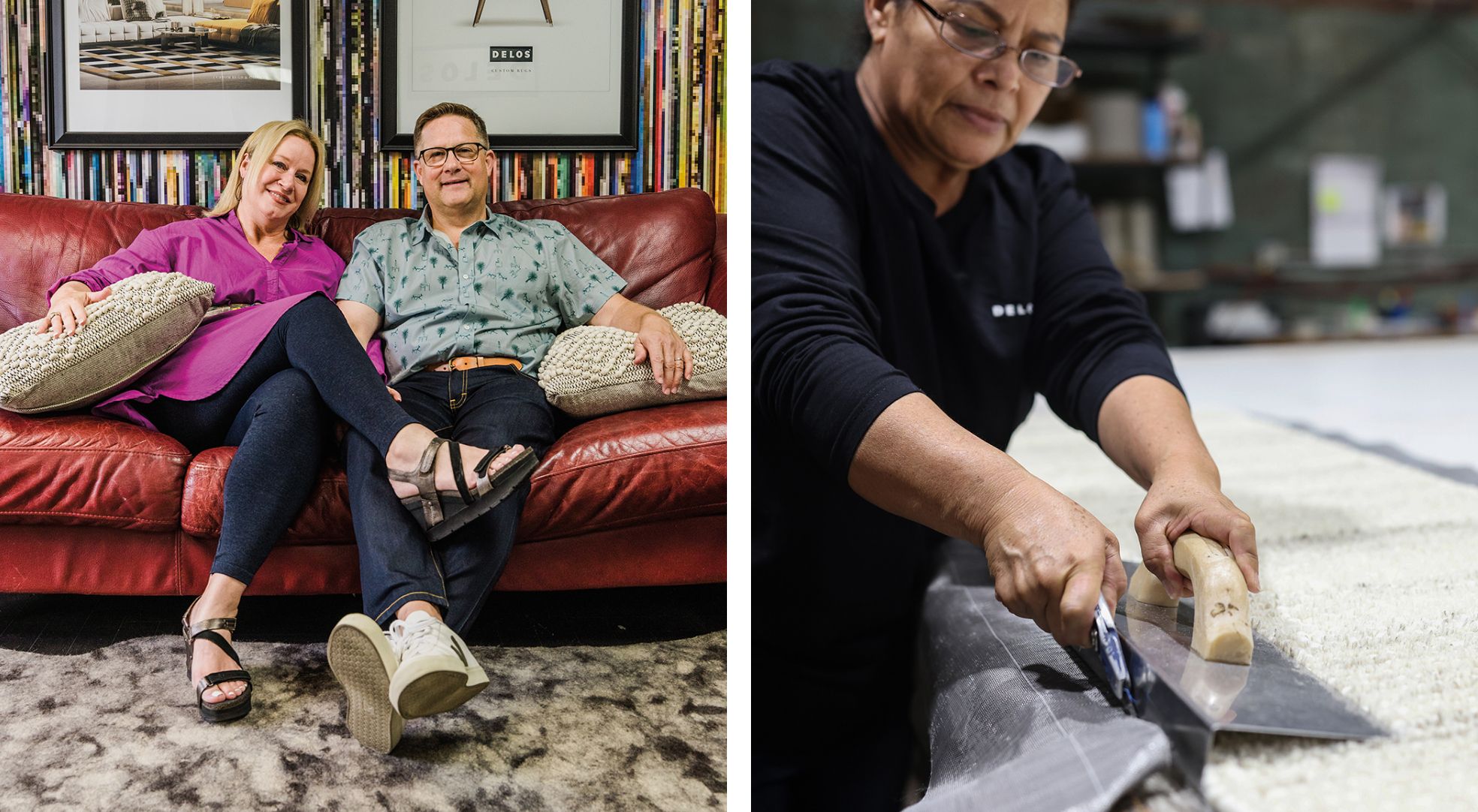 Founders Leah and Ivan Phillips; craftsperson hand finishing a Room & Board rug.
