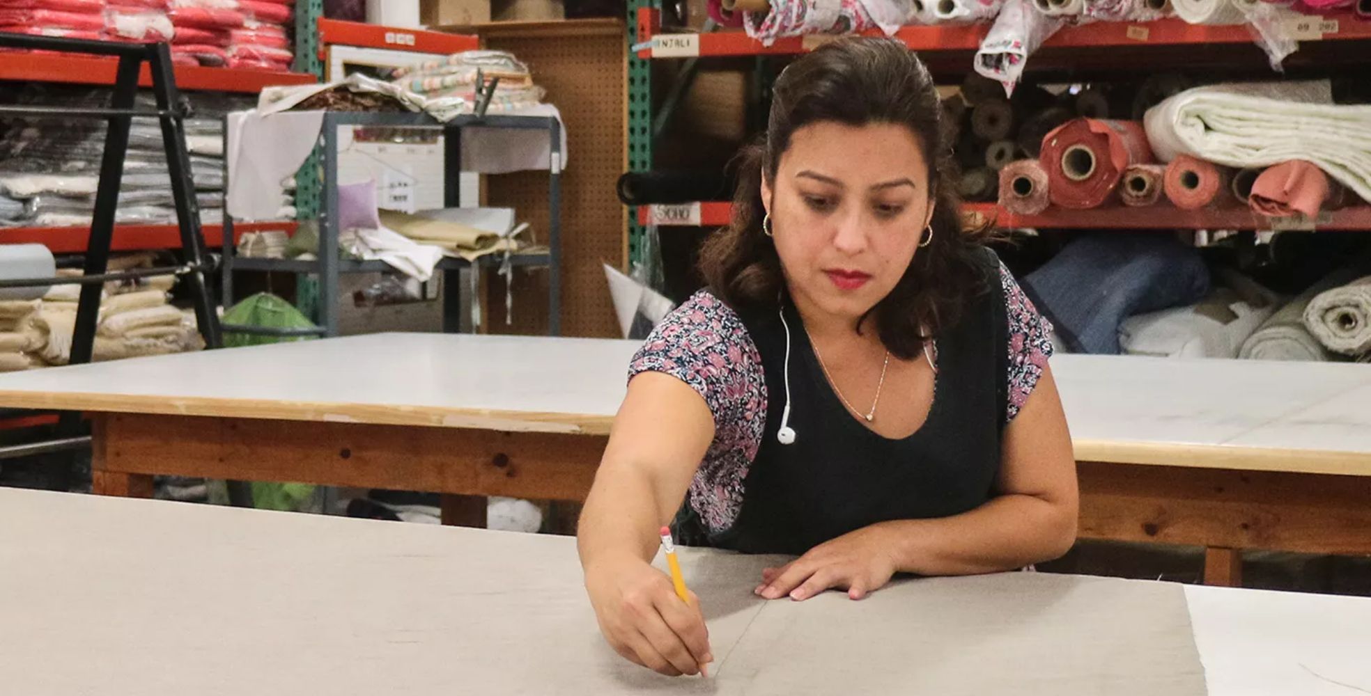 Inside the company's Chicago facility, more than 300 employees trained in the art of design, sewing or upholstery skillfully construct each piece. Delicate fabrics, like linen, are cut by hand, and details are carefully considered to ensure a beautiful design from front to back. "It's really boutique manufacturing," says Lydia Pomey, director of business development. "We do everything one at a time and we take our time with every single product. We don't compromise on anything."