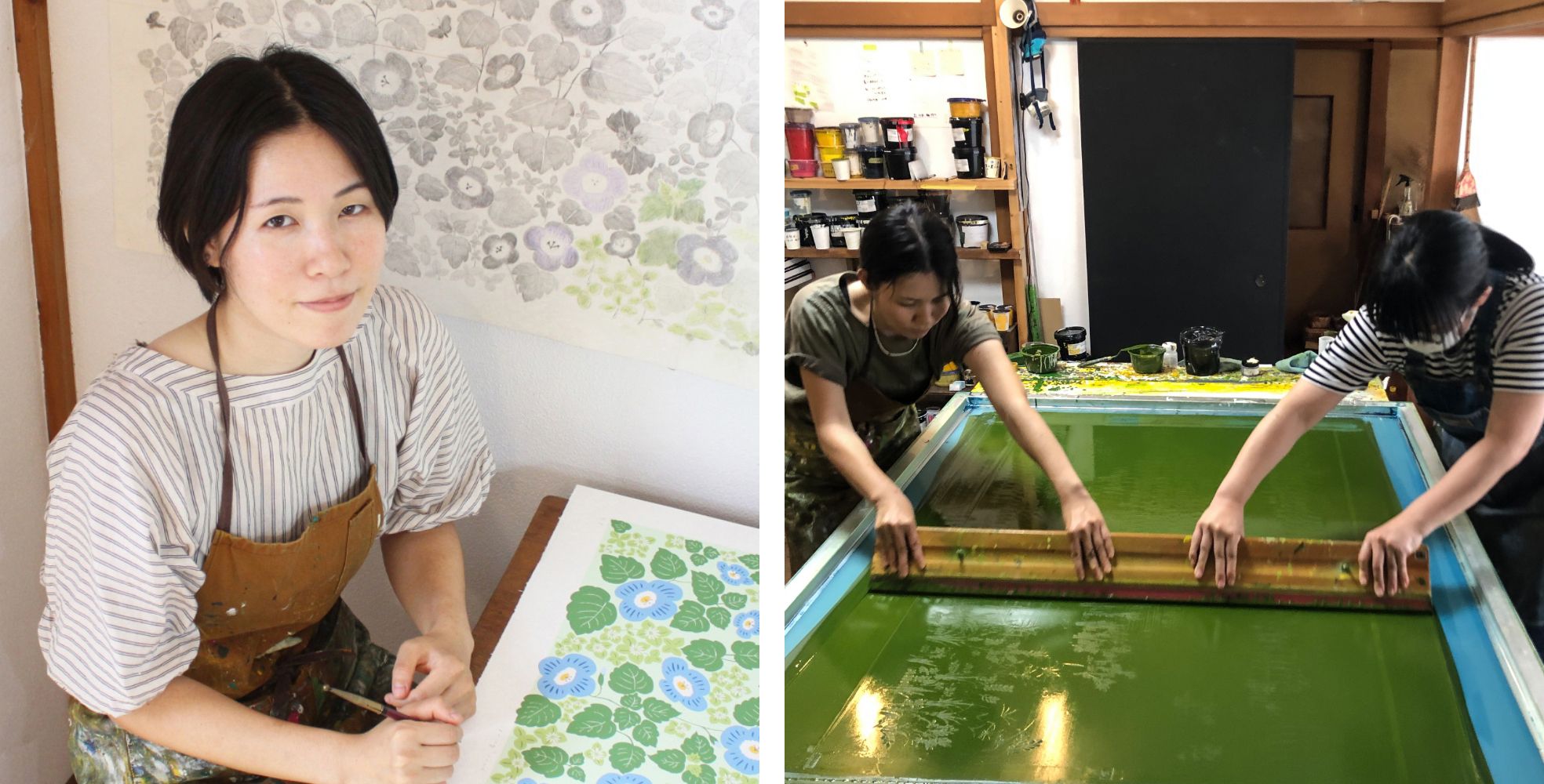 (left) Artist Haruna Niiya(right) Niiya working with her print studio partners.