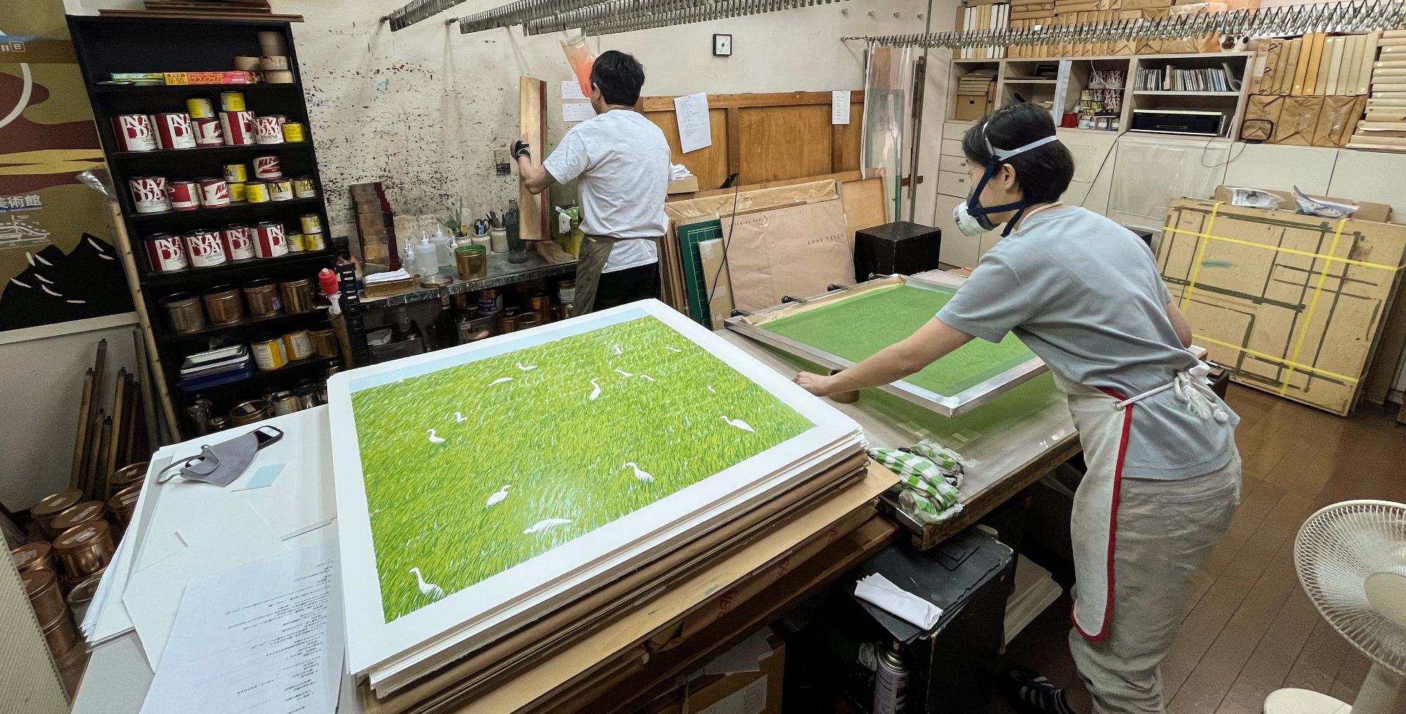 Today, Niiya is a silkscreen fine artist. After she finishes hand painting a piece, she partners with a renowned silkscreen studio in Tokyo. The small team of artisans perfectly replicates her work by designing multiple unique silkscreens to create layers of colors and shapes that are printed one at a time onto paper, reproducing her original at a gallery-level quality. Since each layer of color must dry before the next is applied—and the entire process is done by hand—it takes at least a month to create a series of prints.