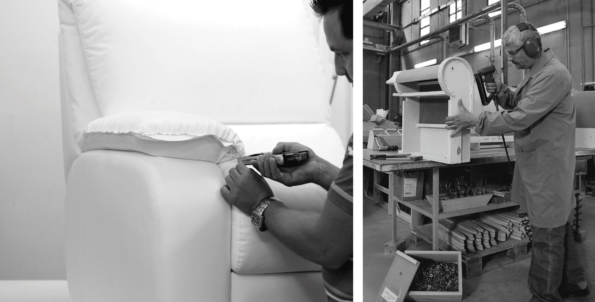 Craftspeople fashion fabric to sofa frames using hand tools.