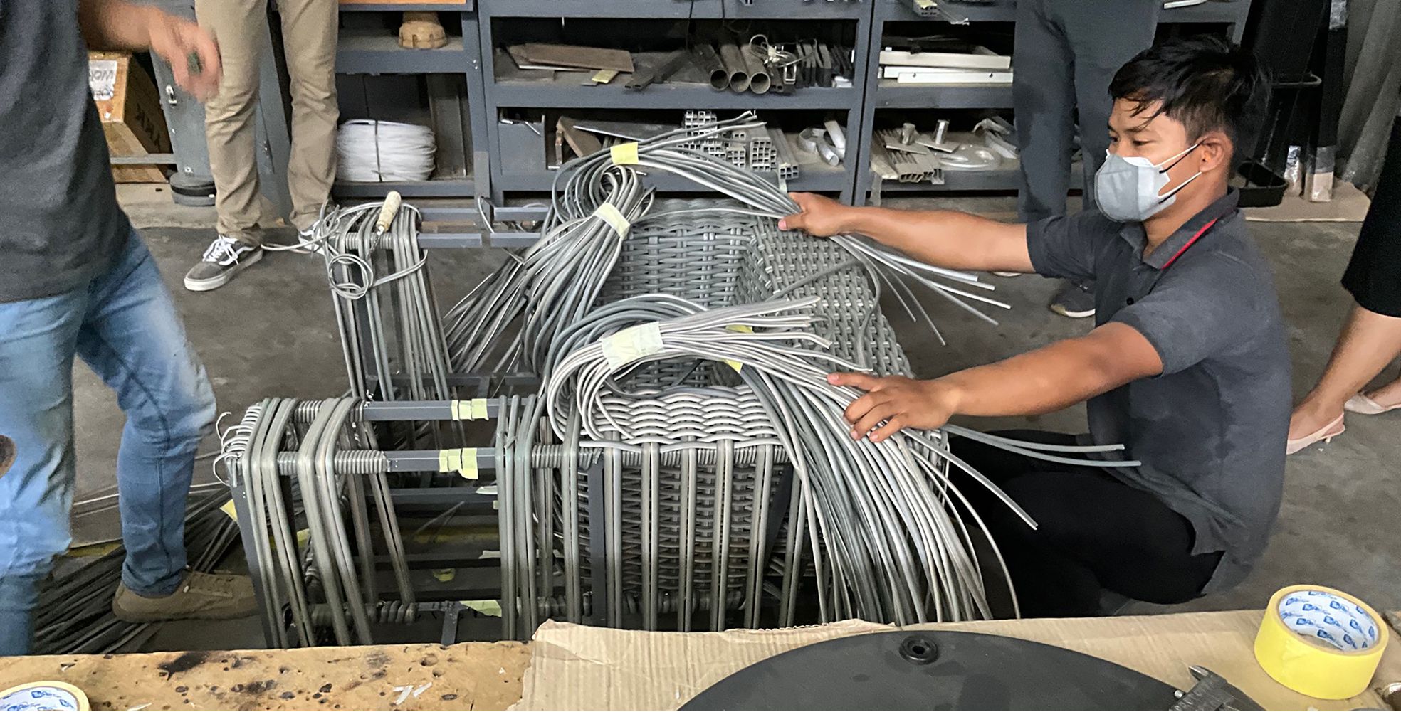 A craftsperson weaves all-weather wicker around a chair frame.