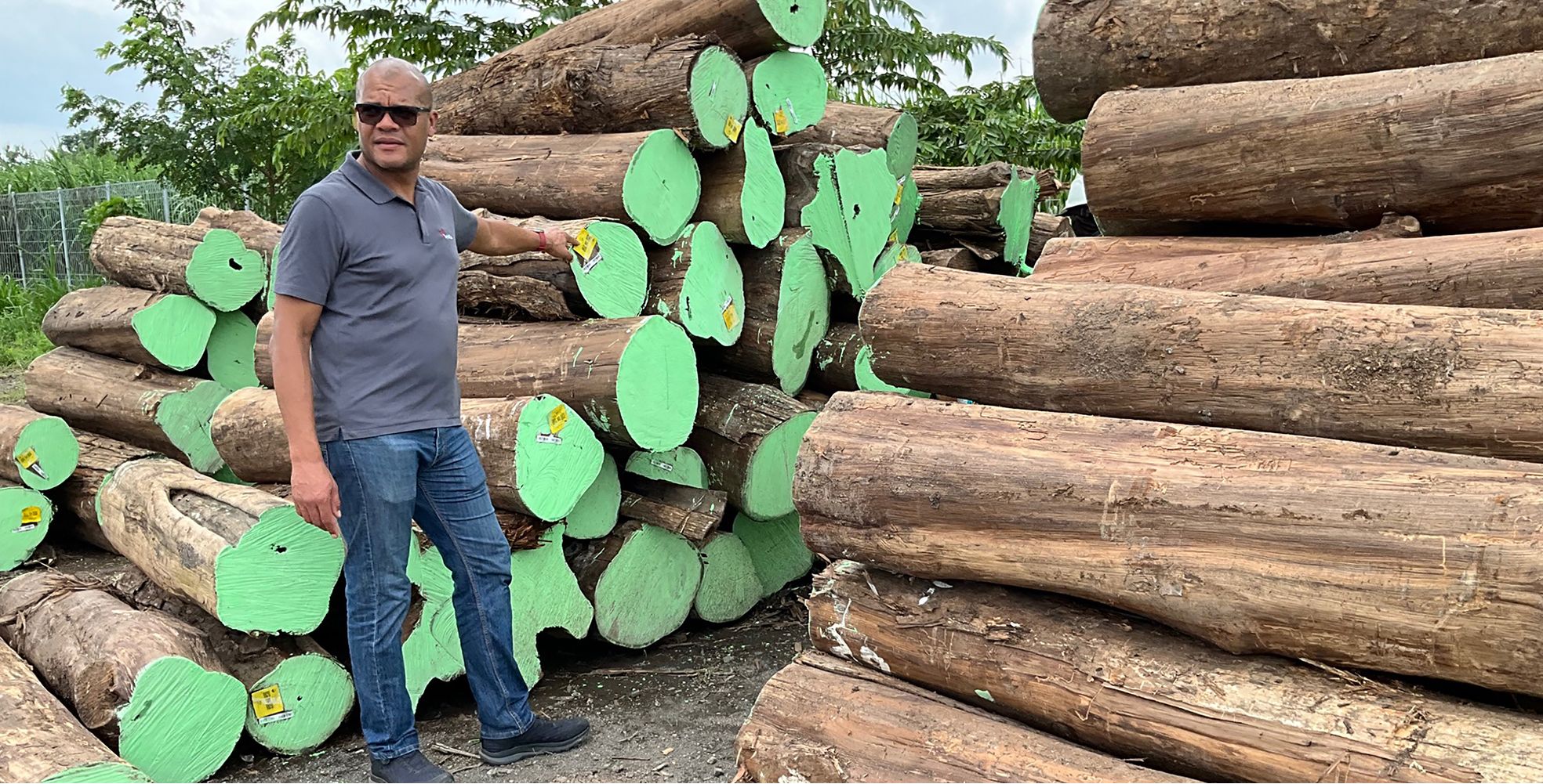 Anders Nørgaard stands beside drying teak logs.