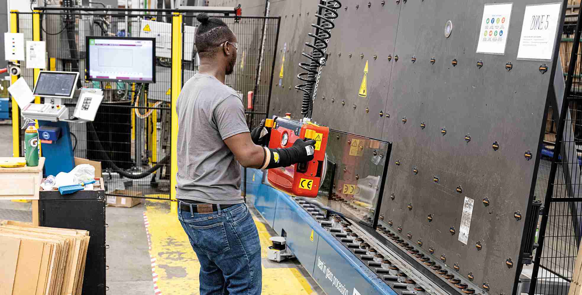 A craftsperson uses a hydraulic lift to move glass panels made in-house.