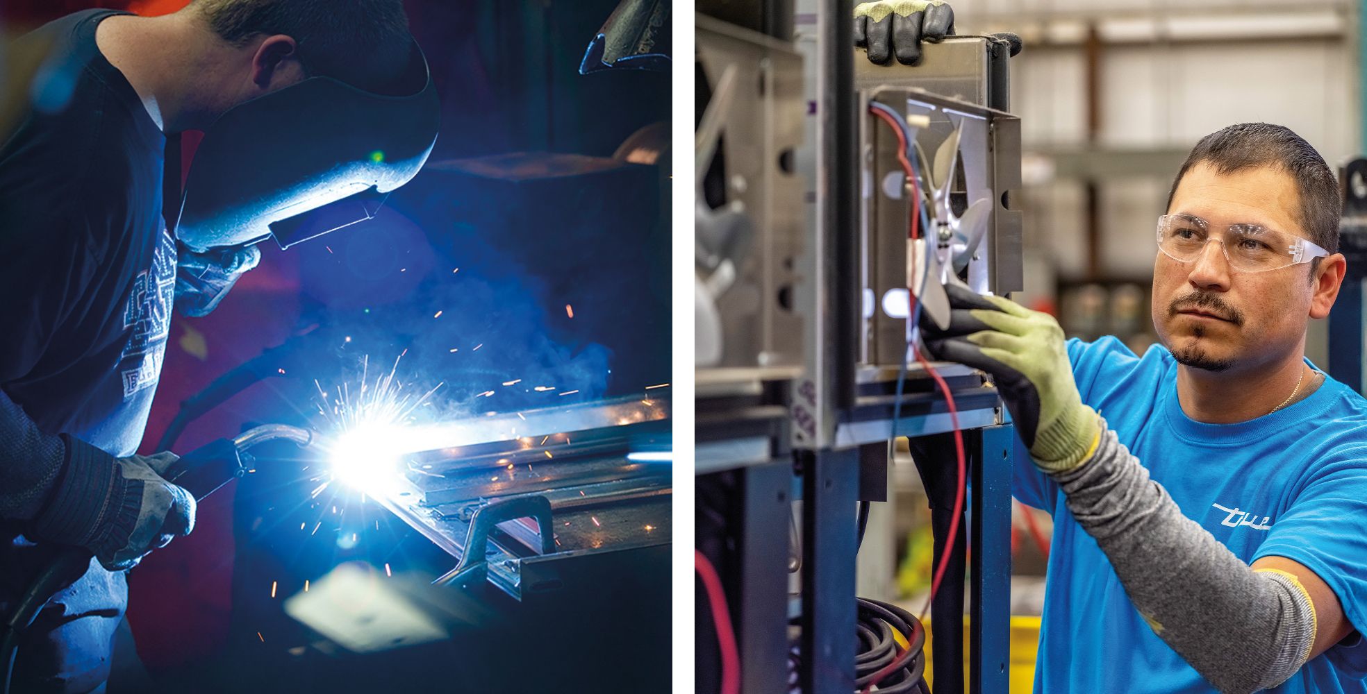 (left) Welding refrigerator components prior to assembly.(right) Installing a fan.
