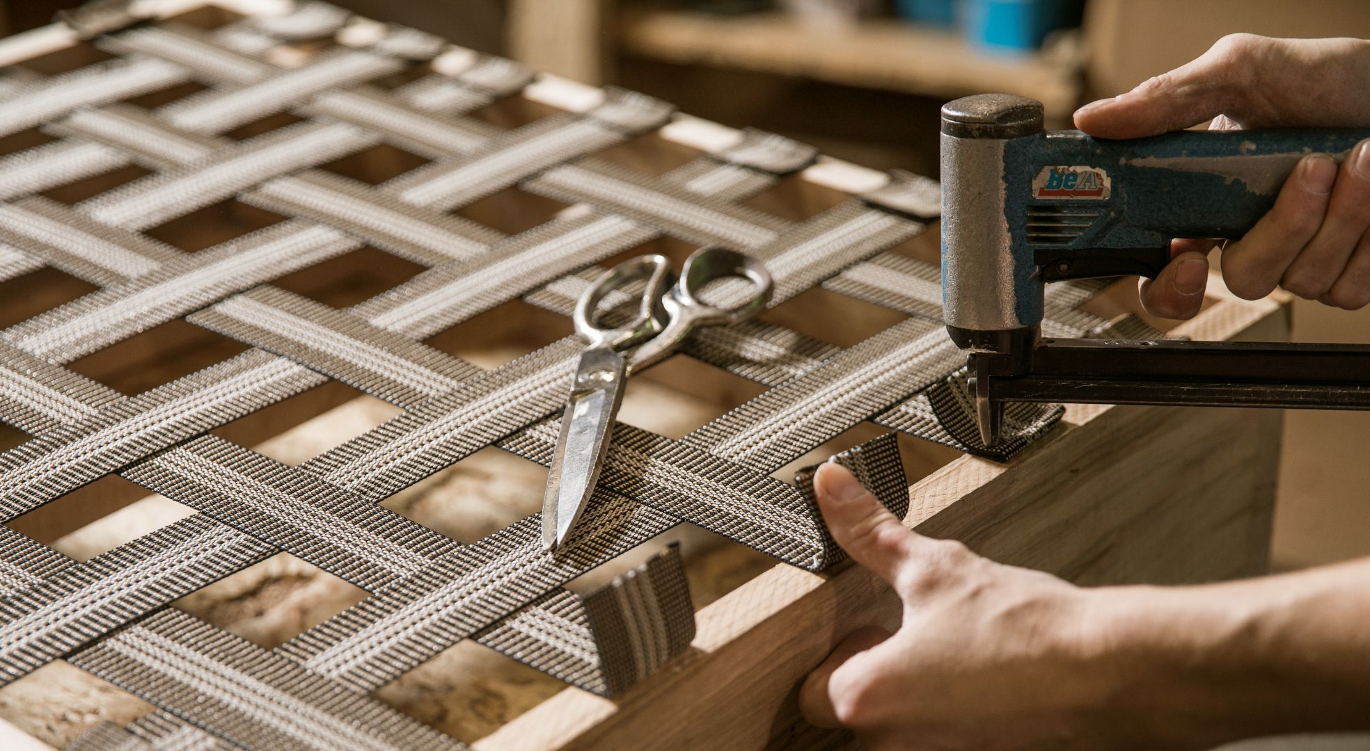 Younger Furniture craftspeople pride themselves on their hand-crafted touches, like attaching seat webbing suspension by hand.