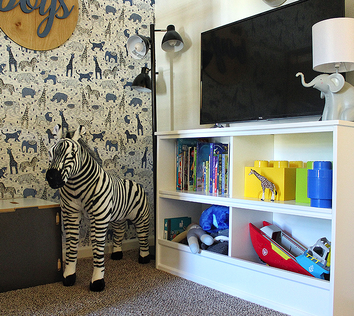 *Wooden “The Boys” Sign from The Polymath Mom/ Etsy + Knit Dolls from Bla Bla Kids + Modern Toy Box in grey from Sprout Kids + Jumbo Stuffed Zebra from Melissa and Doug Toys + LEGO Brick Storage Containers from Modern Intentions – Visit @lunchesandlittles on Instagram for additional room details.