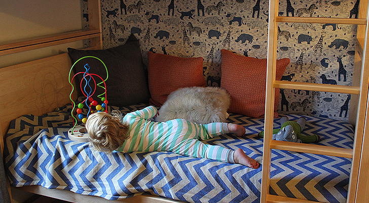 We have three young children, two are boys, and even though they are 19 months and four years old, they are already best friends. At the beginning of the summer our oldest started talking about sharing a room with his brother. At first, we dismissed it, but he persisted, and while we didn’t know how it would all work out, we decided that it was a good idea. So we set out to design a boy’s room, that was suitable for play, fun and sleep… For two!