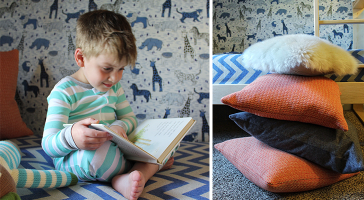 We also chose a couple different throw pillows that the boys can use in their beds, when reading, playing or watching a movie. Our picks included the following: Temple Pillows in Tangerine, Kingsman in Charcoal, and a soft Sheepskin pillow in Stone (my personal favorite!). I love the combination of different textures and patterns in this mix. Great for bedtime, and playtime: perfect to lean on when reading a book or building little masterpieces, etc.