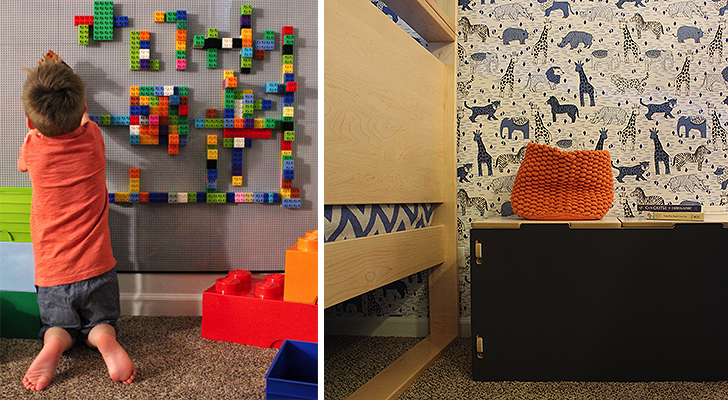 LEGO Wall – Using self-adhesive baseplates from Creative QT, we assembled an almost 5 x 4-foot LEGO wall. We had the idea of doing a LEGO table, but really love how large we were able to do the wall. The size allows both boys to play at the same time, and it has already provided hours of fun. So easy to build; no glue required!
