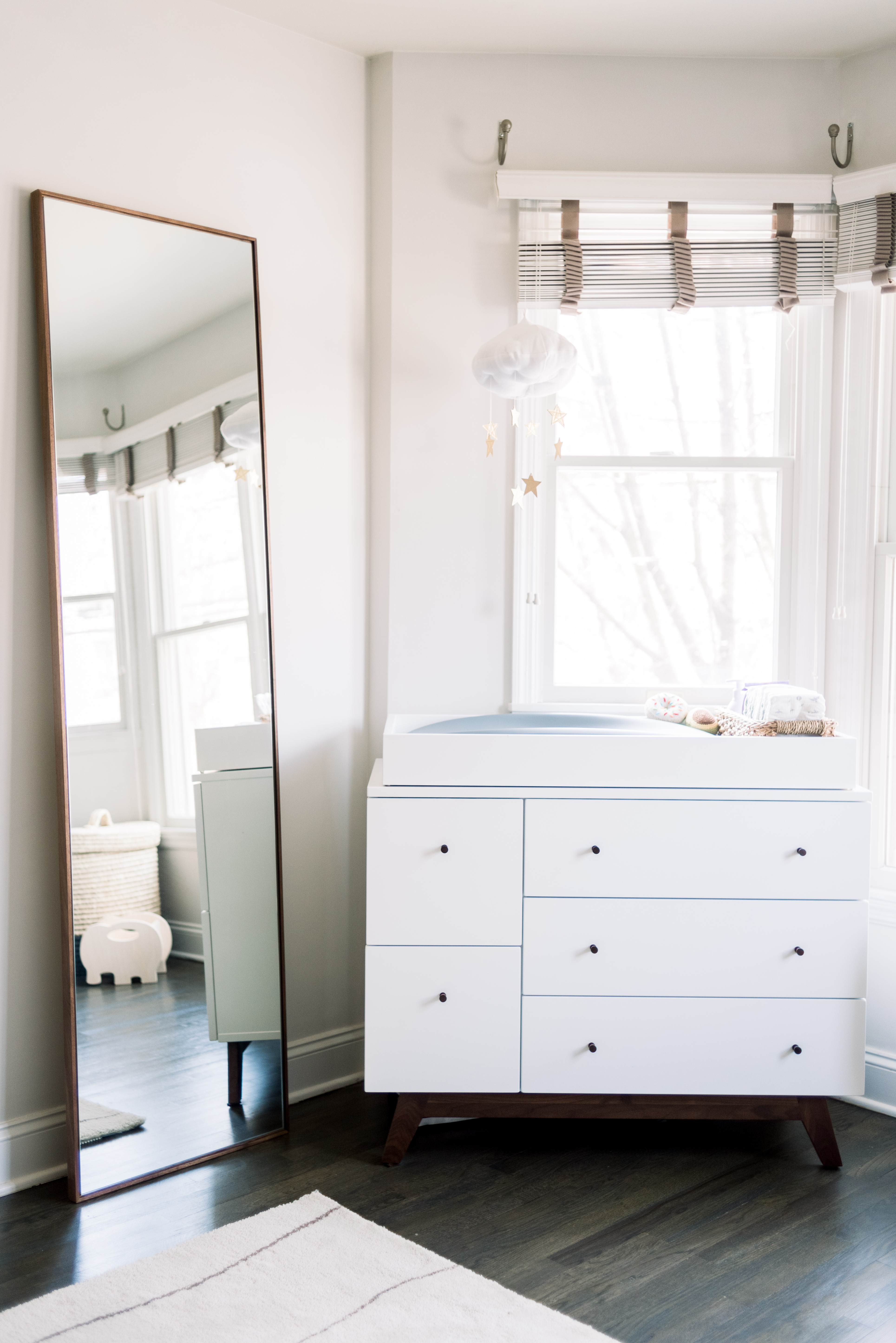 The Flynn dresser features a white cabinet on a walnut base, which Rachel liked because it complements her darker floors. The mirror, which reflects natural light and makes the room look bigger, might be more for her than the baby at this stage. “The mirror you see me posting selfies from in his room (no shame) is the Hudson floor mirror,” wrote Rachel. “It is very accurate as well (you know that is important when mirror shopping!).”