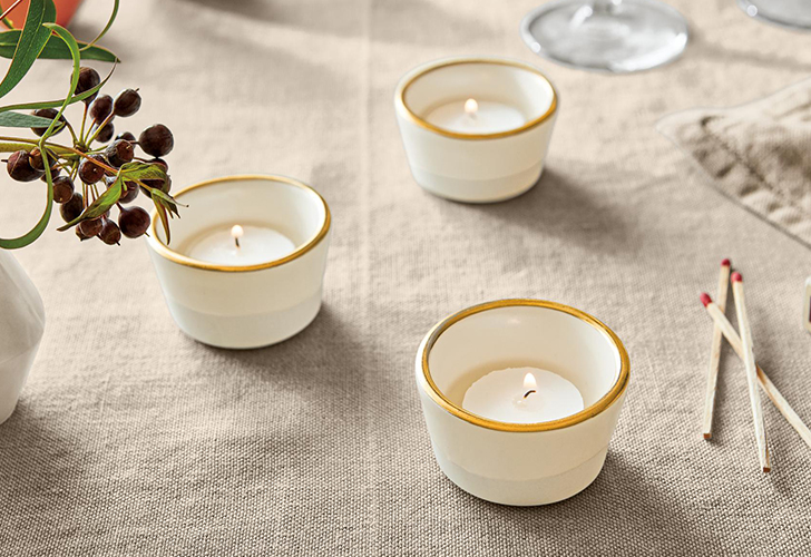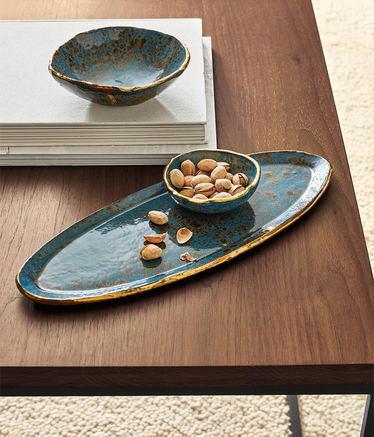 Glimmers of 22-karat gold around the edge of these ceramic bowls ups the elegance.