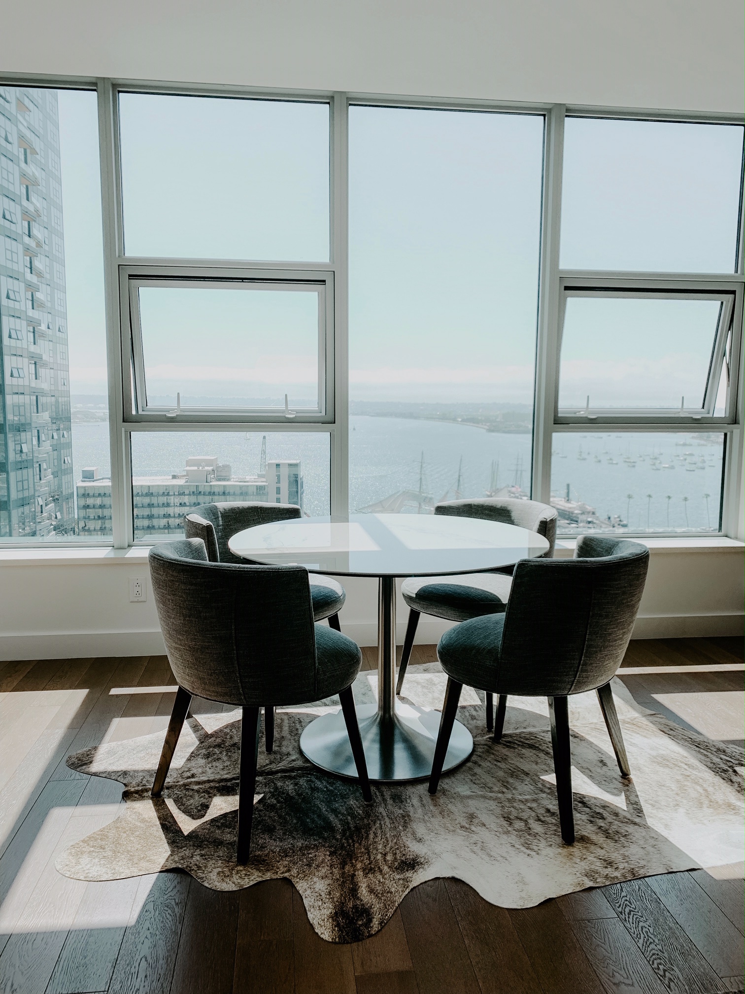 This dining space boasts a marvelous view of the bay. Paired with June chairs, the Aria table keeps things intimate with its matching round silhouette.