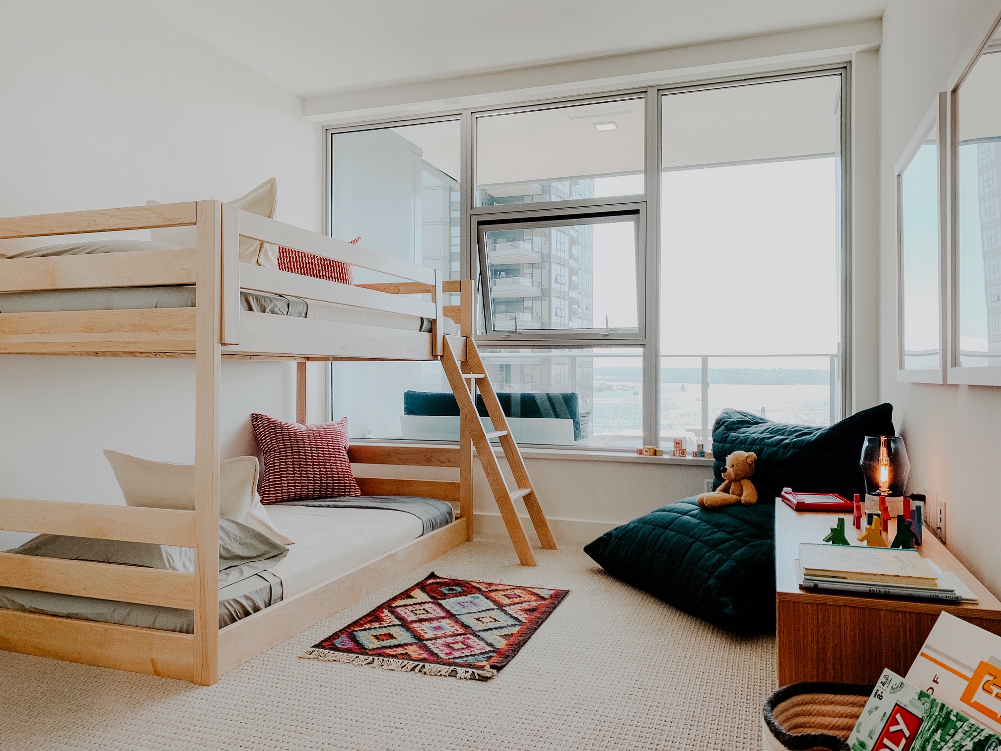 This unit’s second bedroom showcases our Waverly bunk bed in solid maple, a perfect space-saver for a condominium.