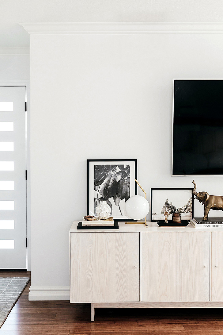 Kim also realized (and laughed) that a lot of the items she wanted to store “weren’t worth showing off.” There were entertaining pieces, cooking supplies, books, dog toys – all of which could be concealed behind closed doors. The family also needed to house a lot of electronics and “there’s nothing that ruins design more than if you have a beautiful piece and all you see are wires.”