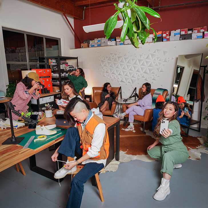 We teamed up with sneaker artists Vicky Vuong and Ann Duskus on their new studio space in San Francisco, CA. Their goal was to create a functional, multipurpose workspace to create content, host workshops, film videos, record their podcast and of course, design and make sneakers! With the help of Room & Board Business Interiors Project Coordinator Anna Mueller, the duo achieved just that. Read on to learn more about Vicky and Ann’s work and see how the studio turned out.