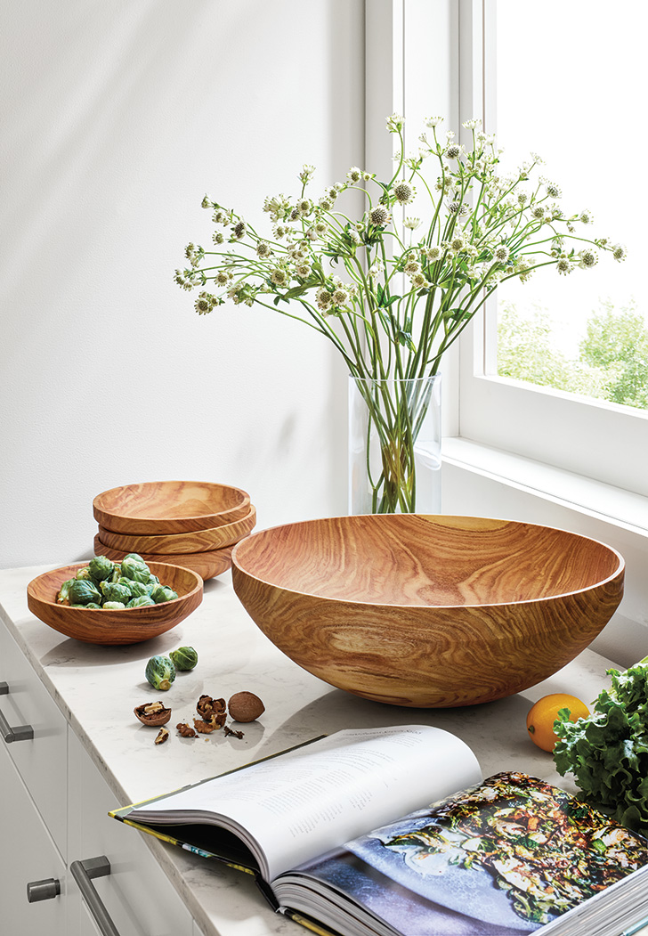 A one-piece wood bowl is more than a functional piece—it’s a treasure. Made from kiln-dried salvaged trees, our Elliott Bowls come from an urban wood project in Detroit. The founders’ philosophy: “To never seek out a living thing to build our own inventory.” Each is unique, due to handcrafted origins and nature’s whim.