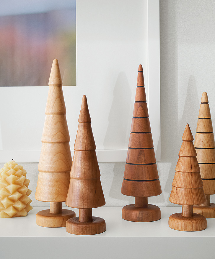 It’s impossible not to be immediately charmed by these mod holiday touches—and in fact the simple, streamlined design makes them a year-round delight. Made of sustainable salvaged wood; just the right size to tuck amongst other decor.