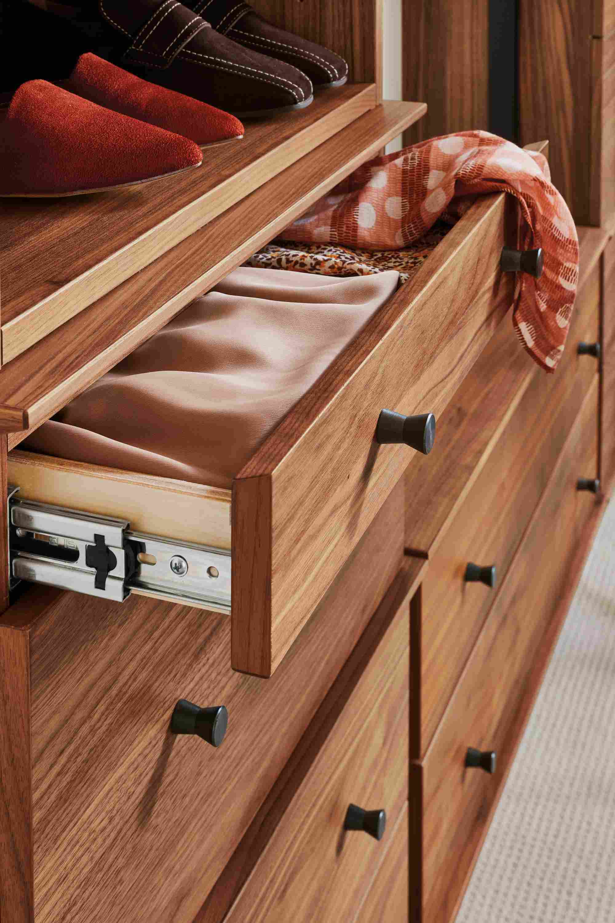 - Drawer Details: full-extension ball-bearing glides; lacquered interior