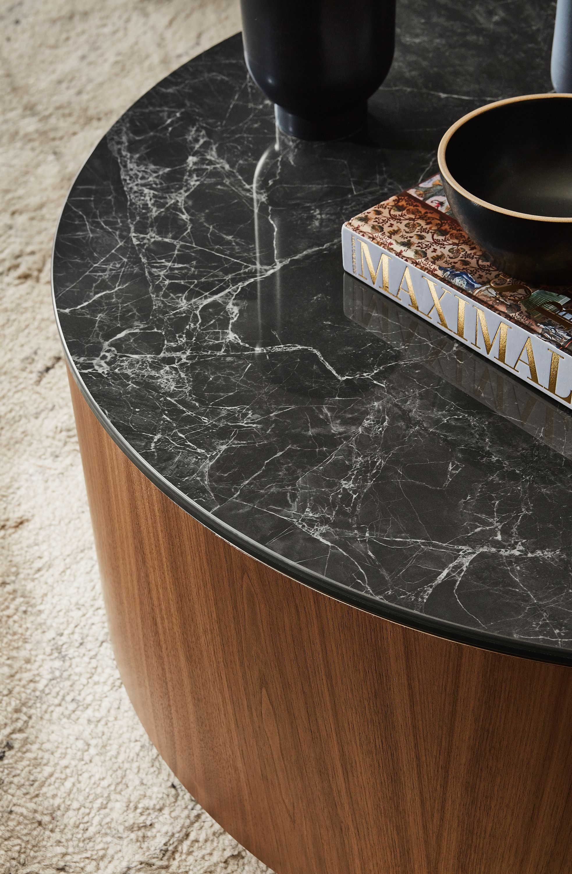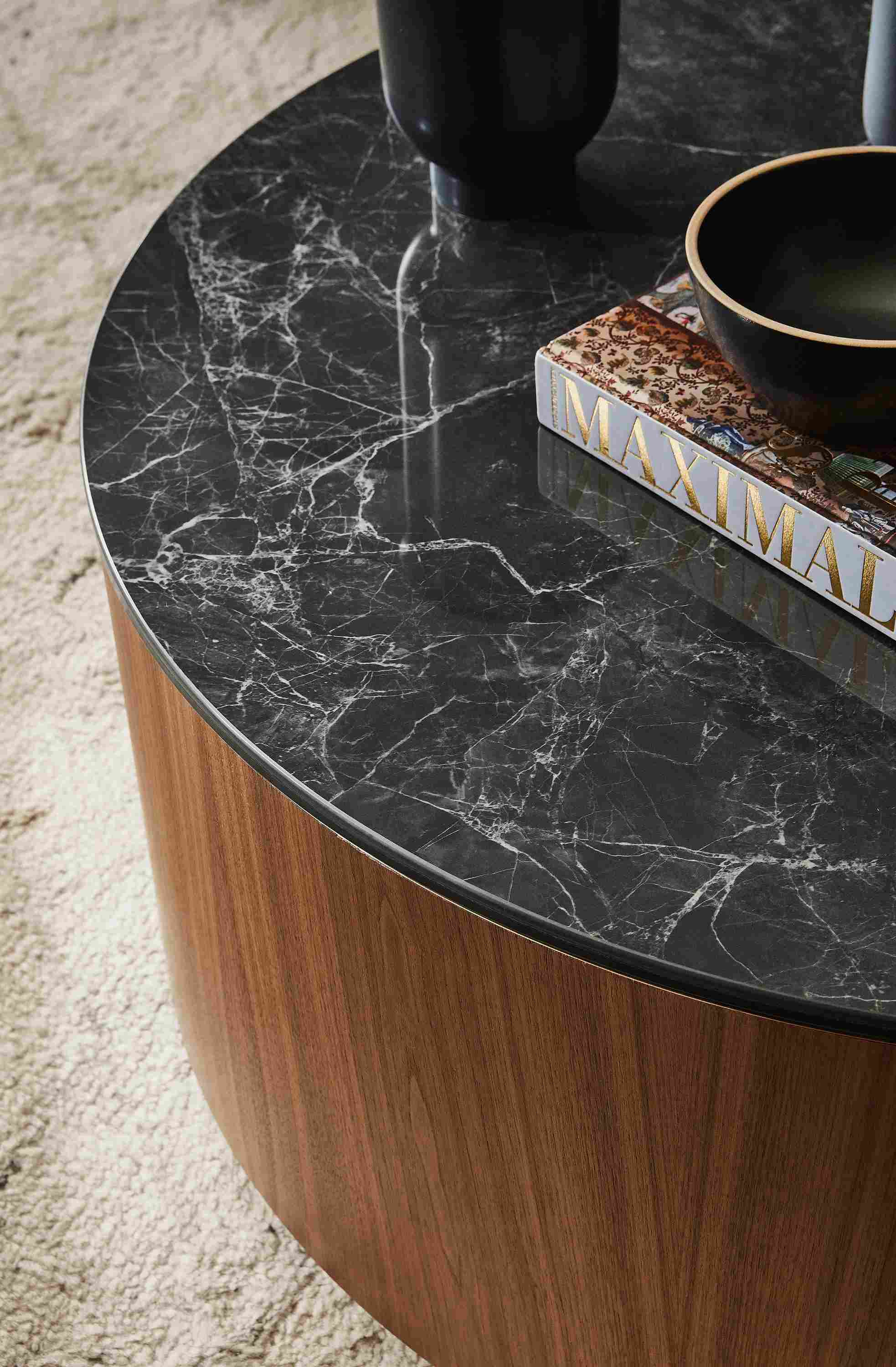 Made by one of the country’s largest musical drum makers, the wood base of this modern coffee table showcases the seamless beauty of expertly crafted wood veneer. A monolithic showstopper in small spaces or large spaces, the Liam coffee table is customizable to your taste and available with or without a stone top.