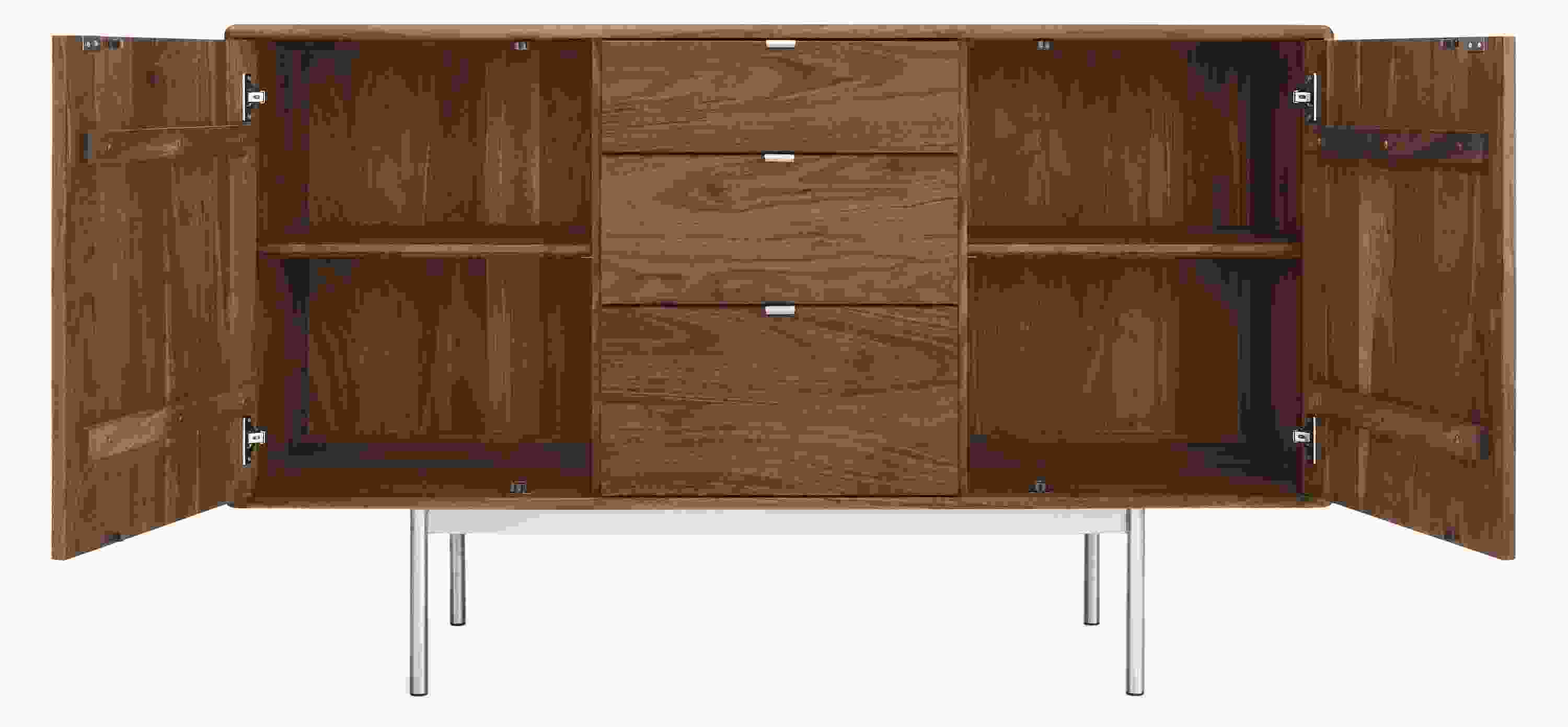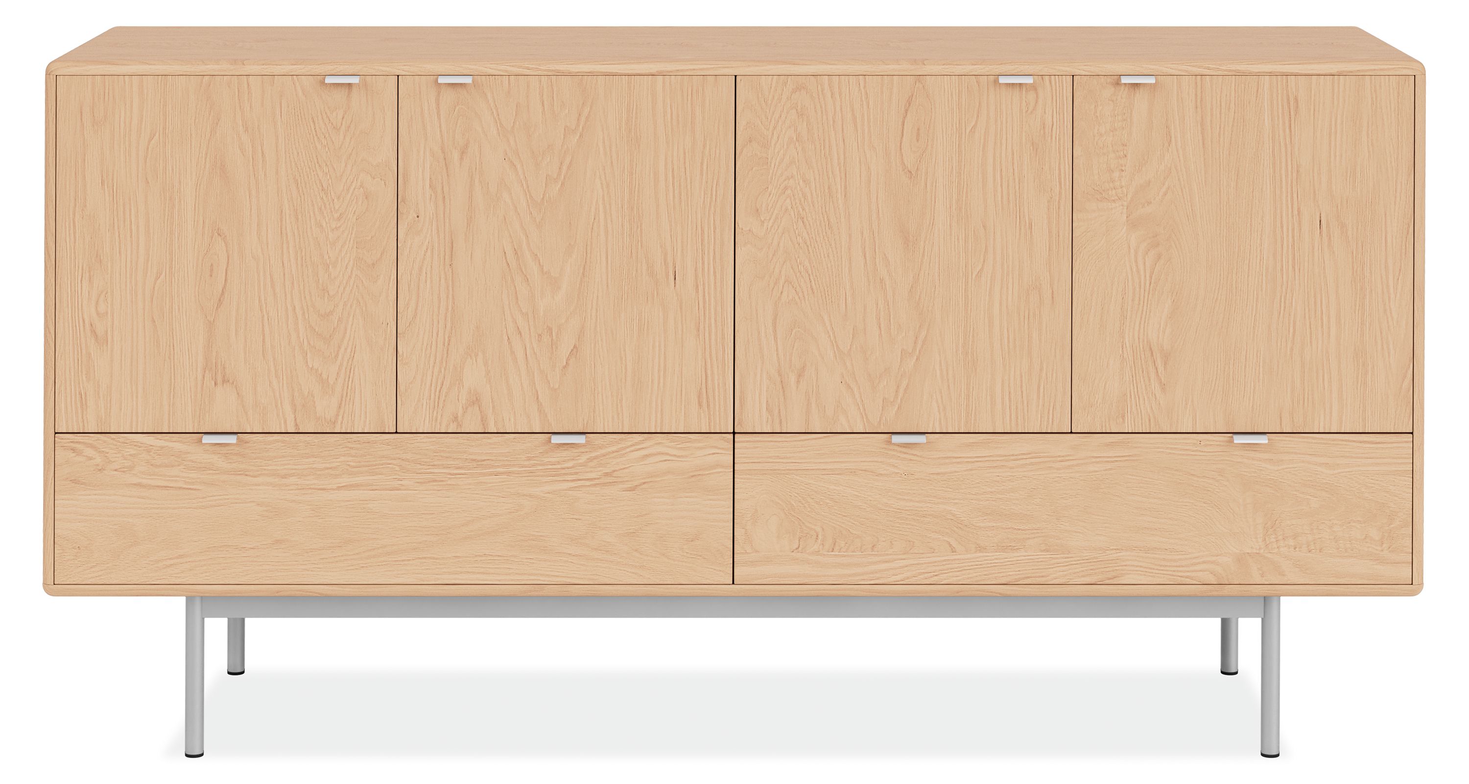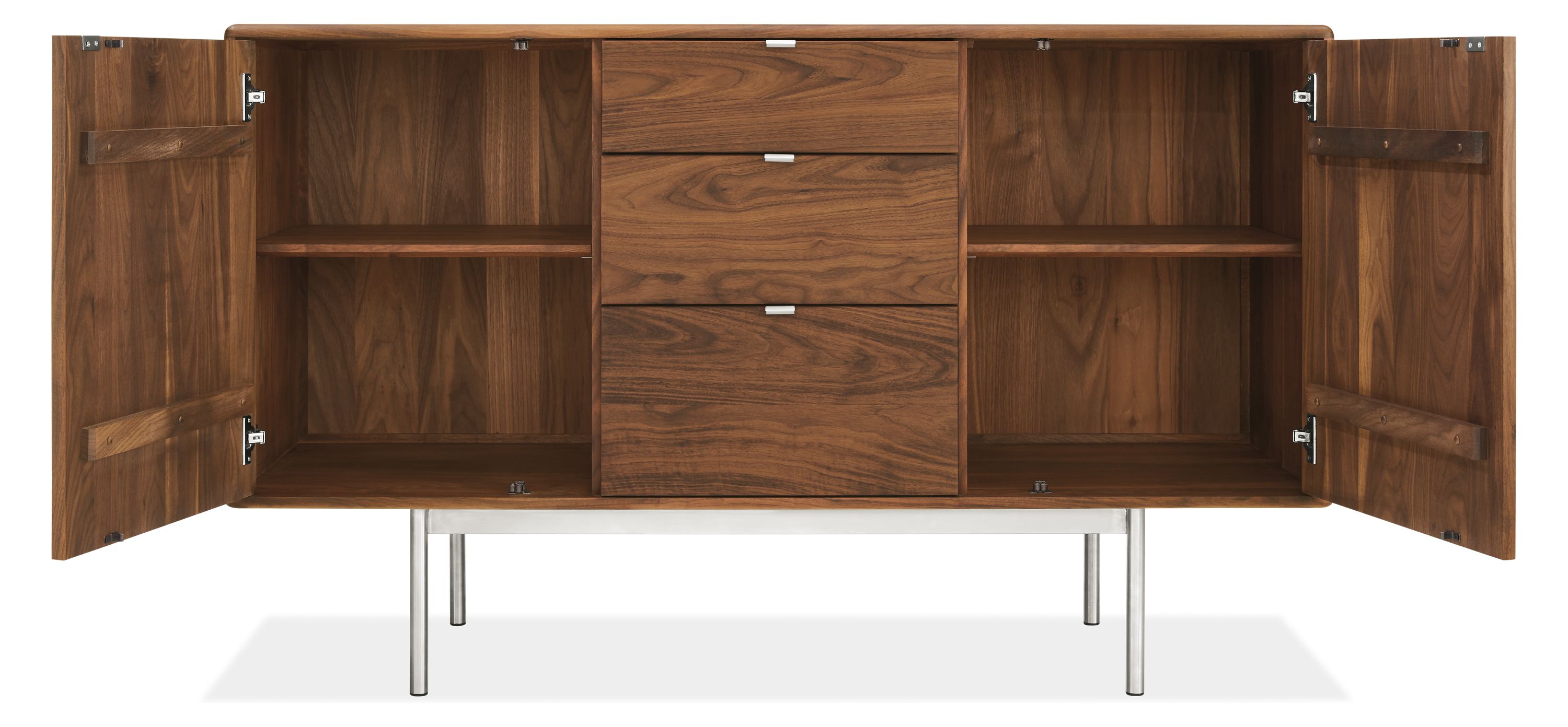 Our Hensley storage cabinet brings a soft and modern silhouette to your home. Inspired by the timeless appeal of mid-century design and infused with modern details, Hensley features a stunning mix of materials that give it an updated look for today. You'll love the smooth feel of the domestically sourced solid wood, and appreciate the durability and beauty of the brushed stainless steel or powder-coated graphite base. Softly curved door and drawer pulls mimic the rounded edges of the cabinet to round out this sophisticated storage option.