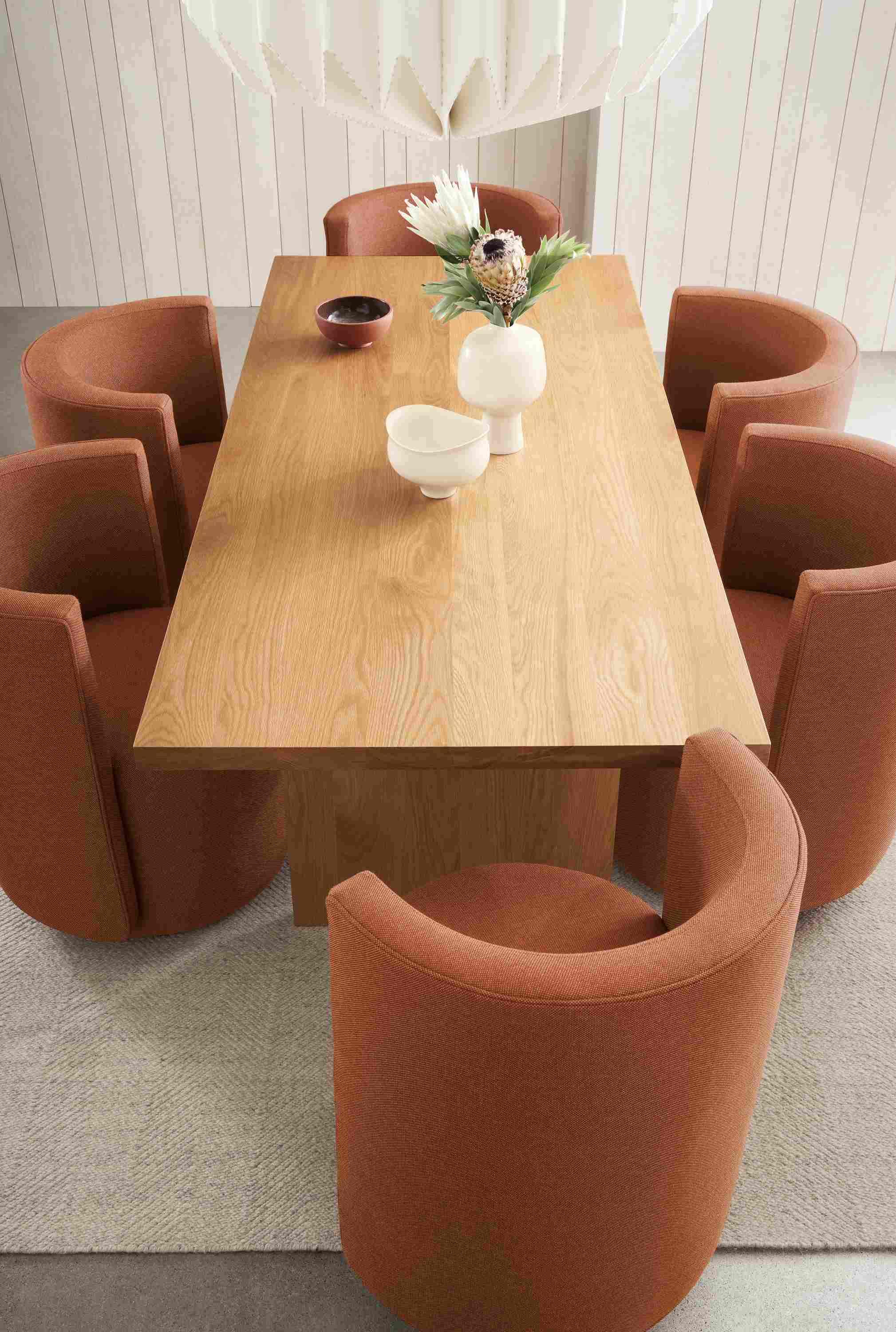 Sleek and eye-catching, our Como dining chair invites a relaxed dining experience while highlighting a fresh modern design. A cozy curved back coordinates with the round seat for a clean silhouette, while the supportive cushioning and fabric choices—and sturdy caster wheels—provide everyday usability.
