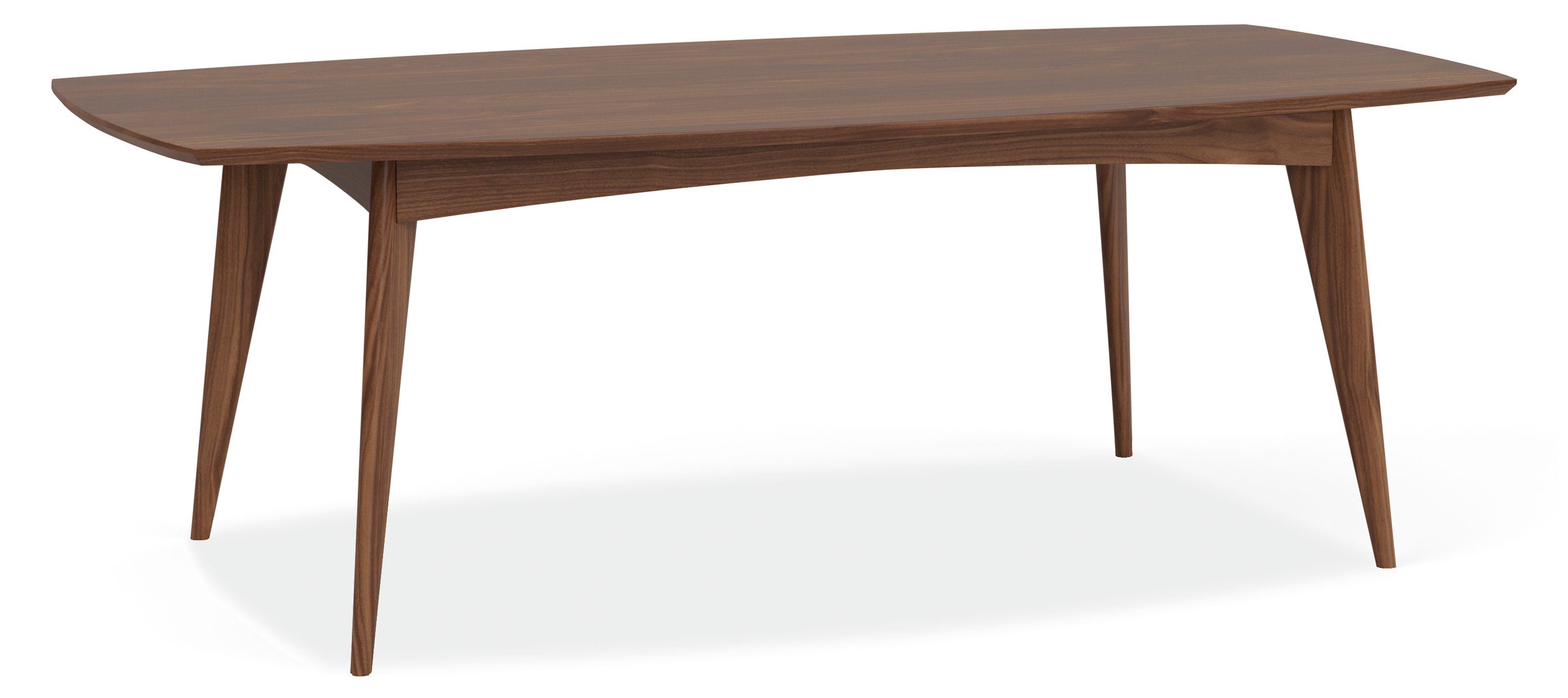 A beautifully shaped top and splayed, tapered legs give Ventura a distinctly mid-century look. Made in West Virginia, the reverse-beveled top edge and unique, tapered legs are indicative of the care and craftsmanship that goes into each table. The design showcases the warm, distinctive look of solid wood.