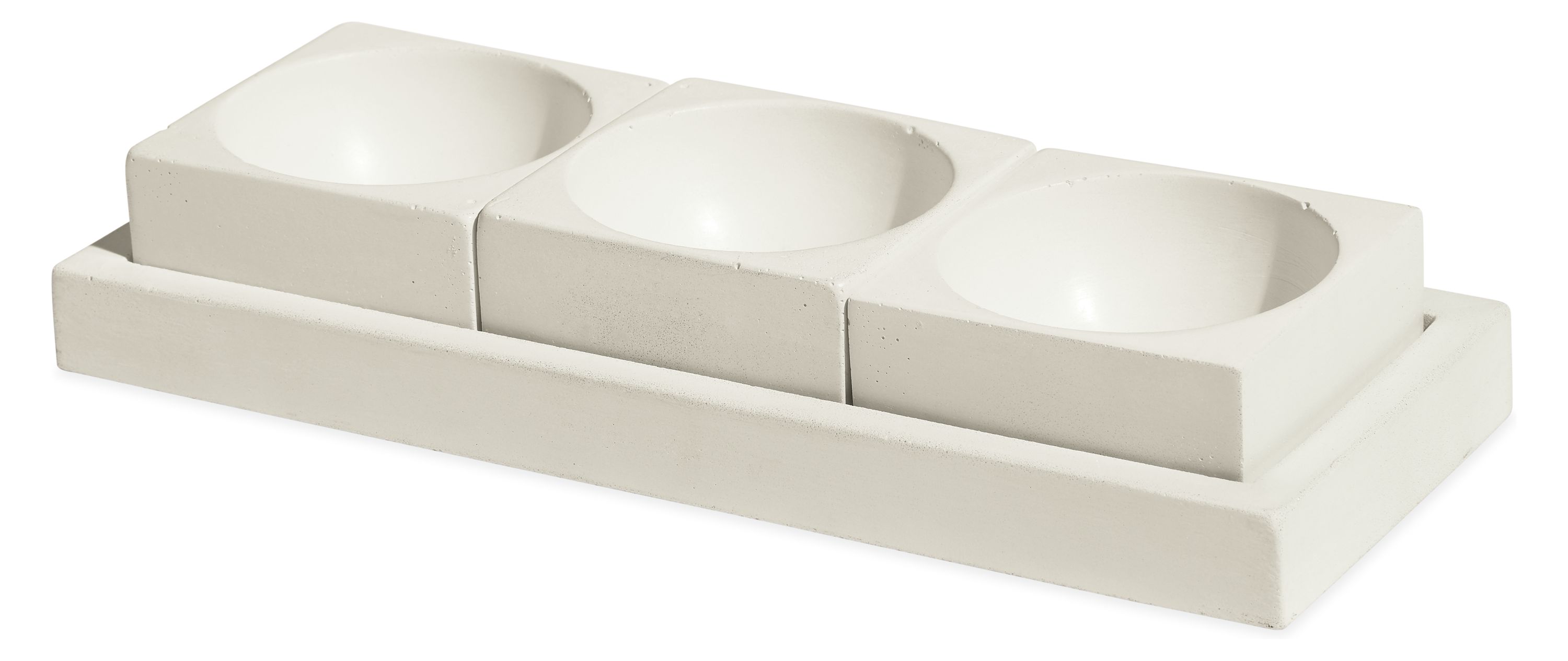 These modern pinch bowls are made from a special concrete formula that feels uniquely smooth. The proprietary recipe, developed by a family-run company in South Carolina, includes recycled stone dust to help keep waste out of landfills. Each pinch bowl is burnished with a sealer to protect the finish and has a cork bottom.