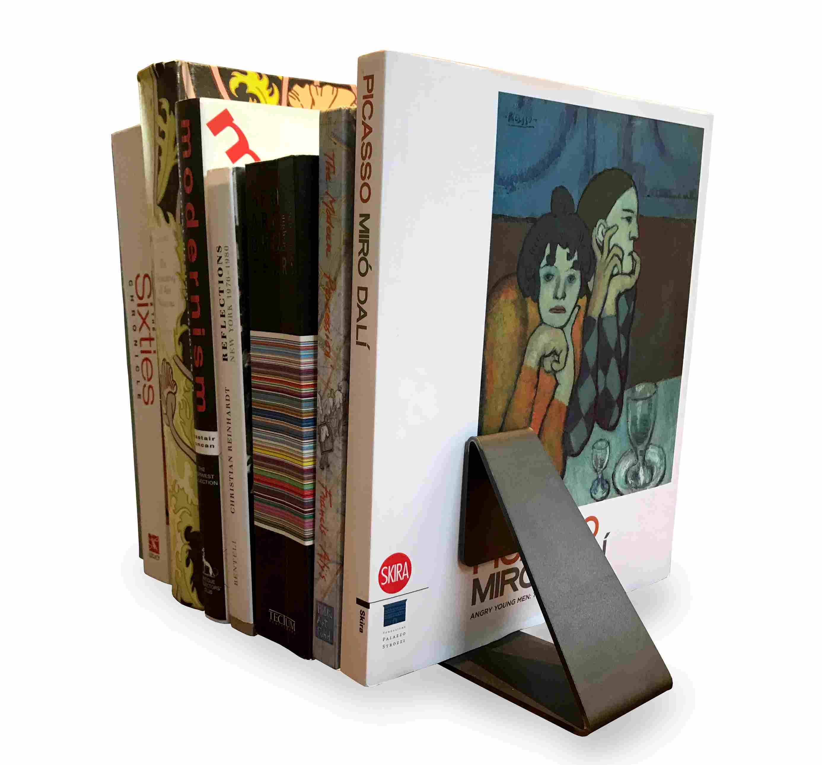 Artisans in Minnesota bend natural steel to make these sculptural book ends. The open shape adds modern style to bookshelves, desks and console tables.