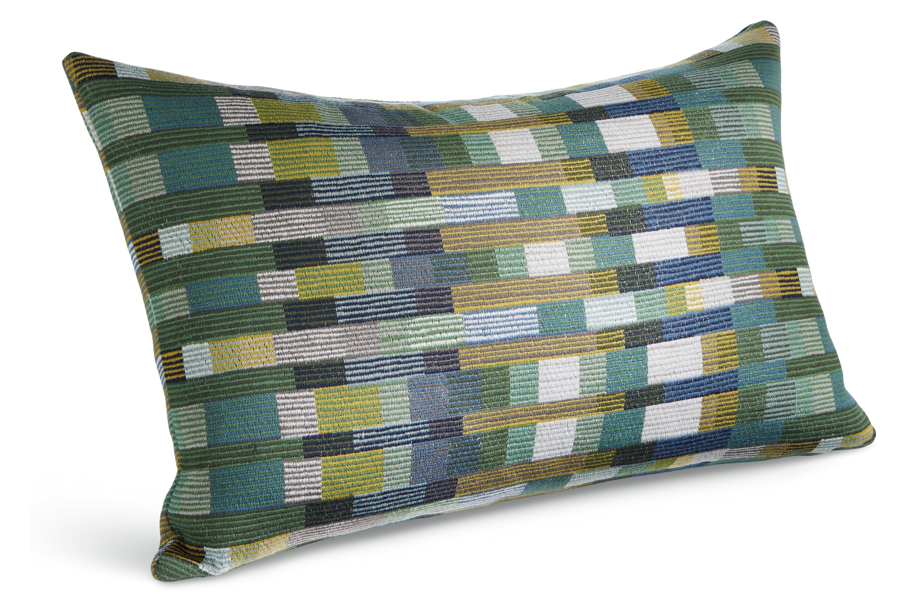 A geometric multicolor pattern crisscrosses this modern pillow, adding a vibrant visual depth to your room.