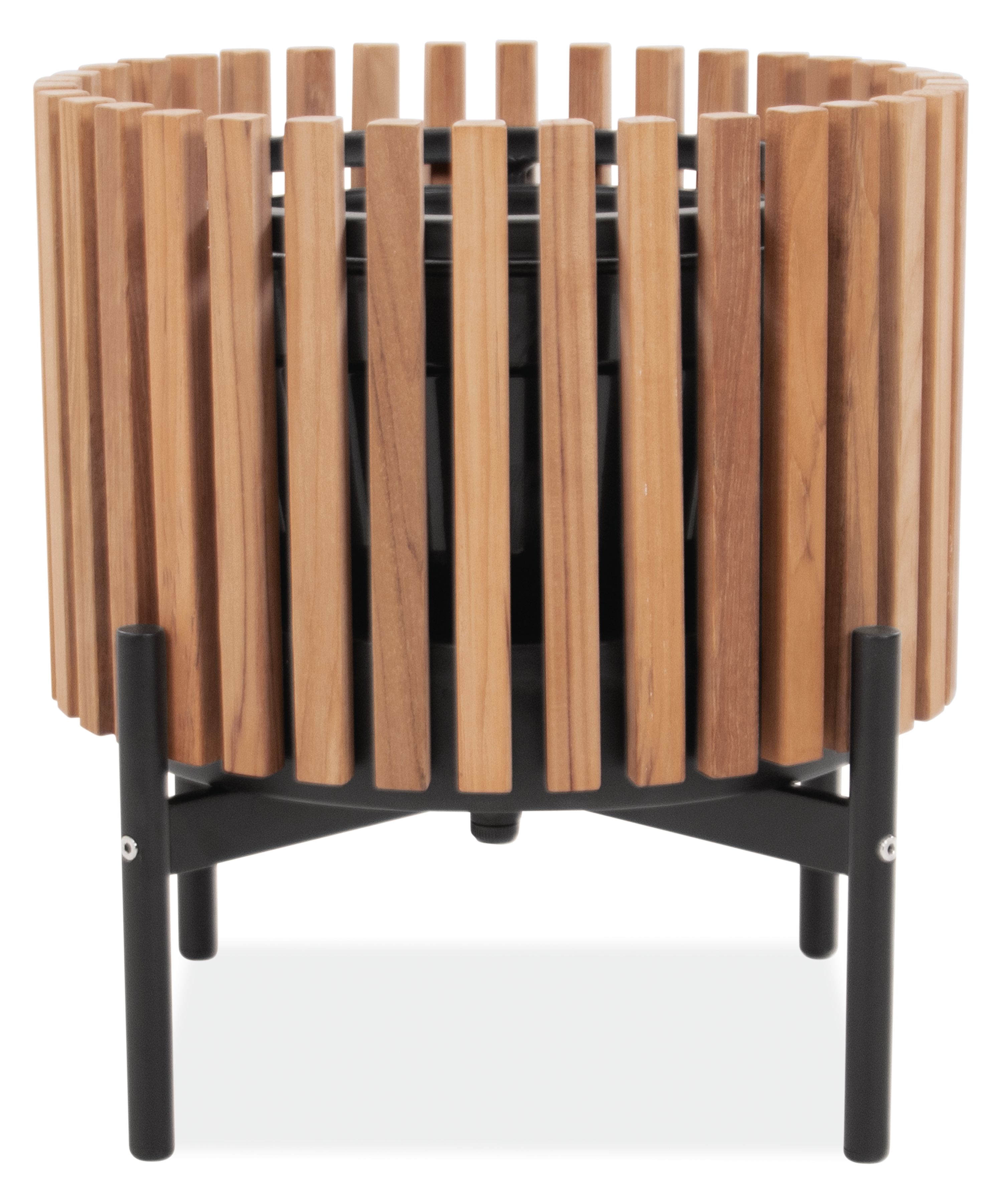 Slats of sustainably sourced, solid teak heartwood surround this planter, adding the beauty of natural wood to your space. Hidden within the planter is a liner with a drainage hole. The stand adds style and height, and can bring your plants closer to sunlight or visually free up floor space.