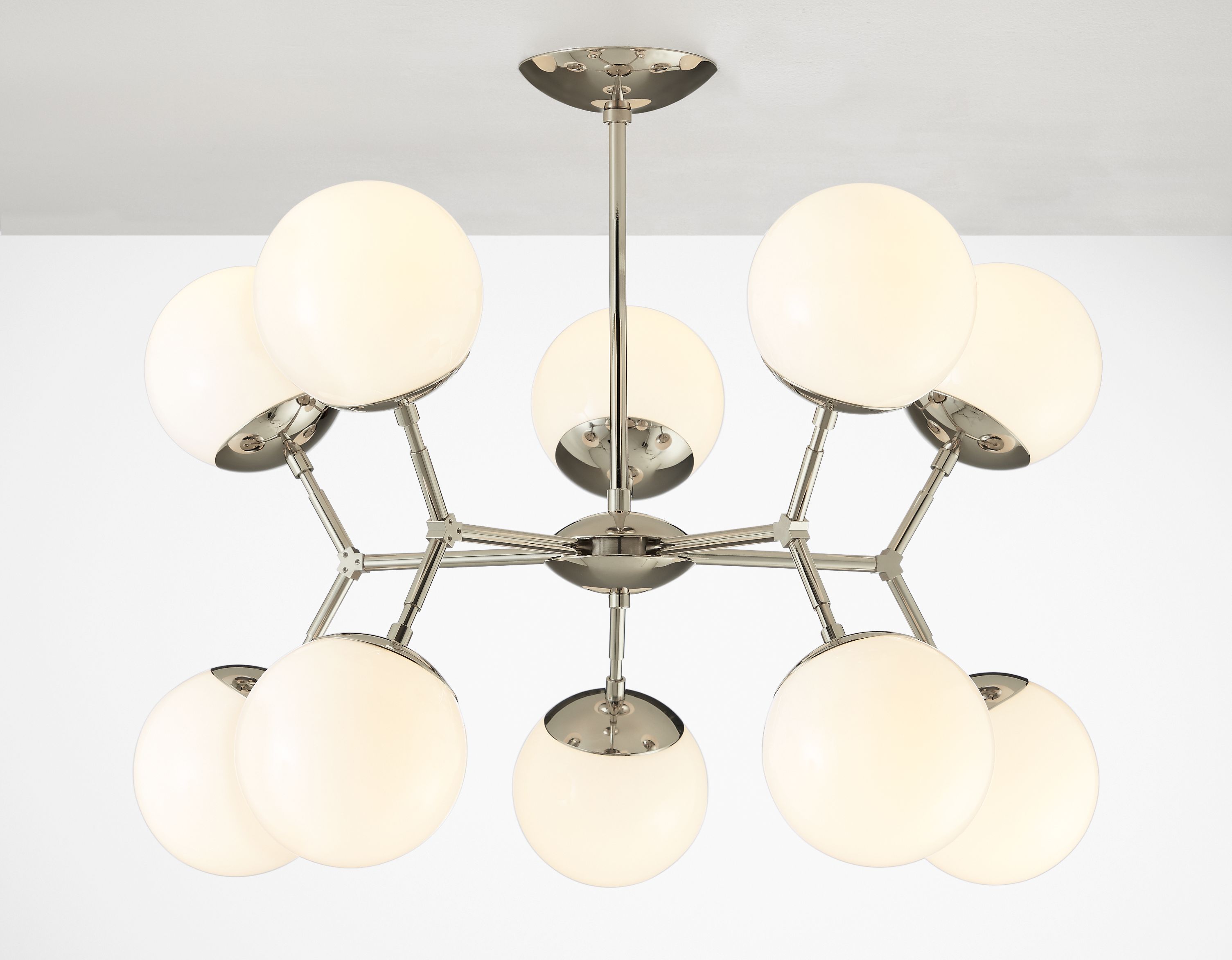 Our Cosma chandelier is a stylish statement piece that leaves a memorable impression. The white glass globes have dimmable LED bulbs that provide a bright soft glow for even lighting.