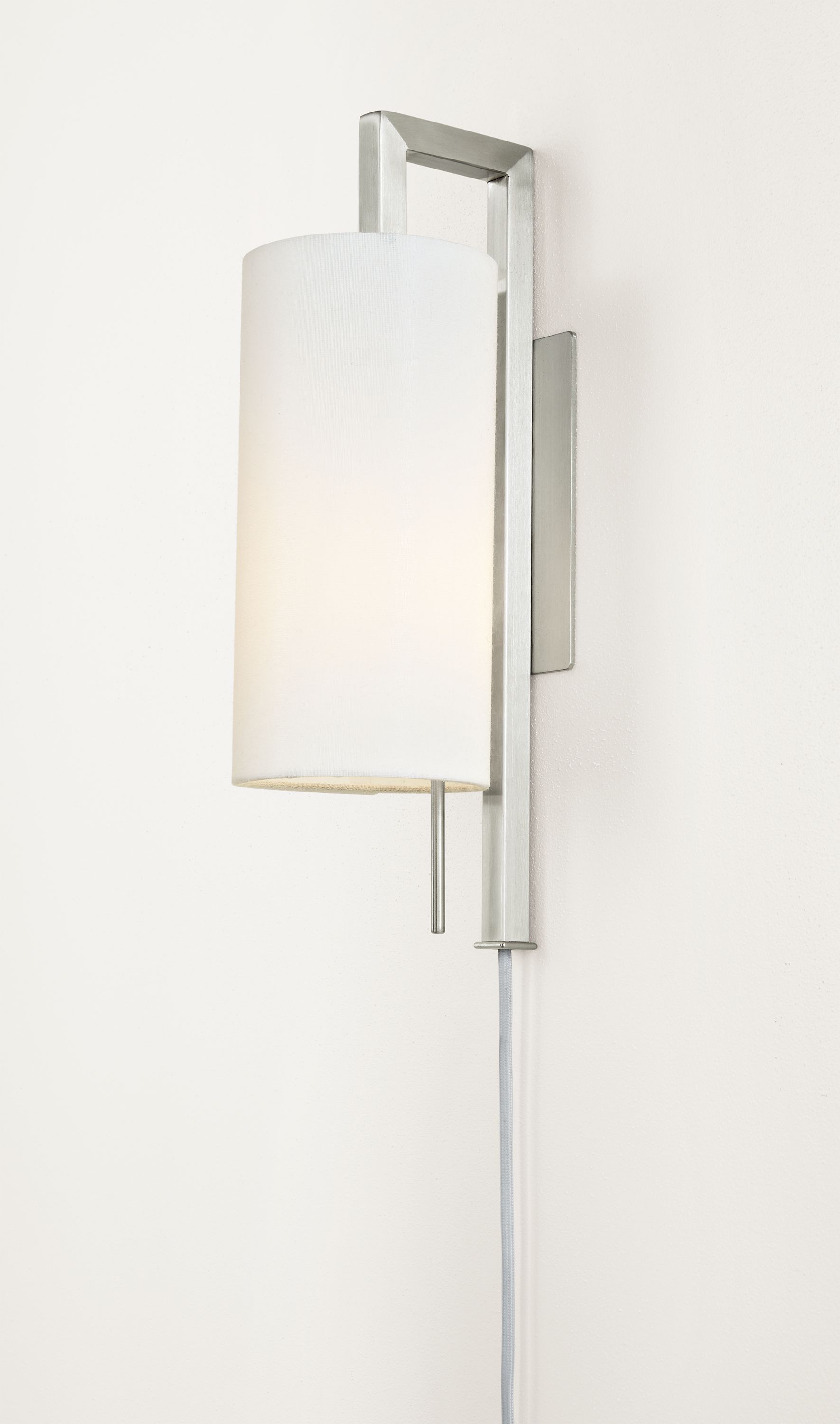 This modern wall sconce pairs the architectural lines of artisan-welded steel with a cylindrical shade for a study in complementary shapes. With a narrow profile, Leslie is a great solution for small spaces. The hardwire installation option makes it an ideal solution for bathrooms, too.