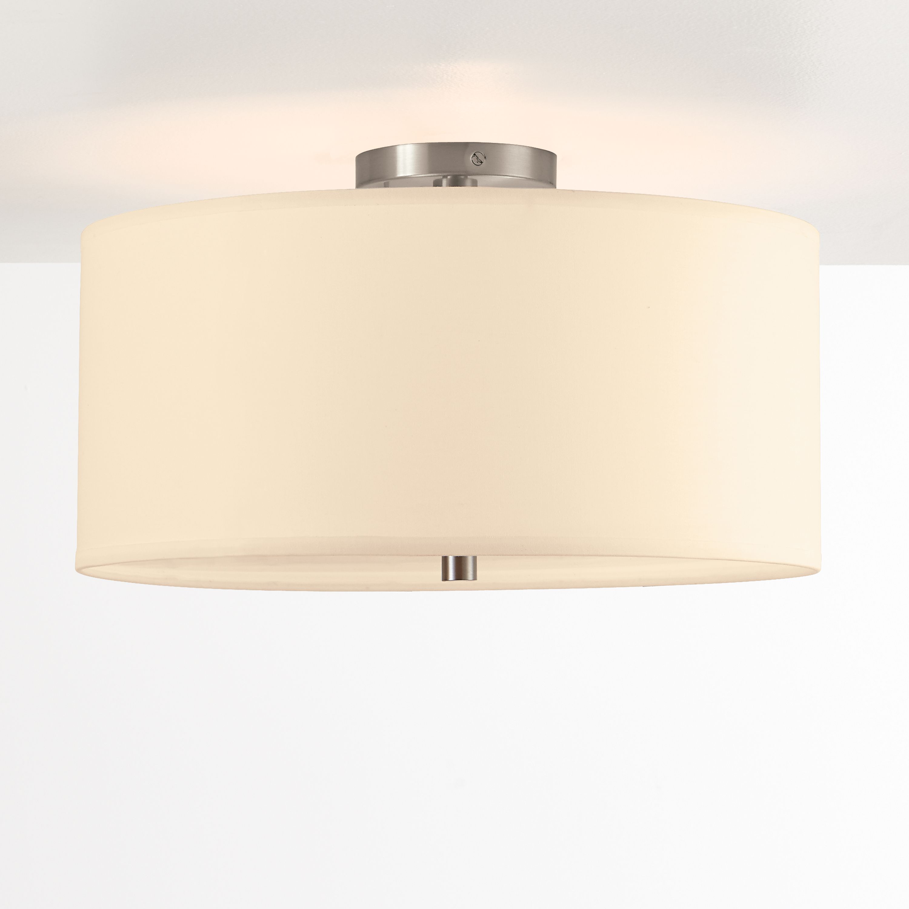 The clean, modern design of our round flushmount pendant provides general lighting and a soft, diffused glow. Flushmount fixtures work well in rooms with lower ceilings and keeps sightlines open in any room. The included ceiling plate has a silver finish.