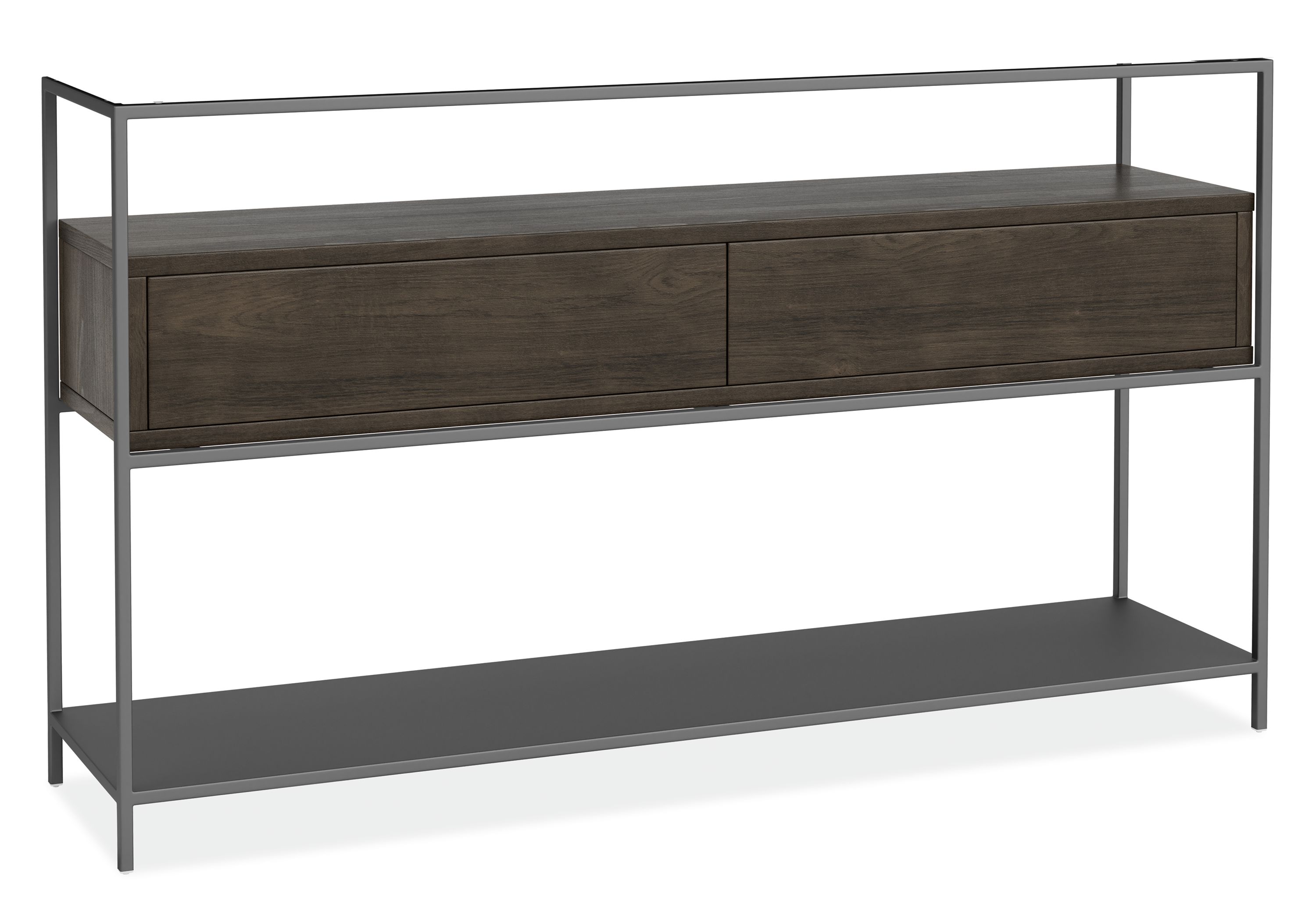 Our Williams console table pairs beautiful and hardworking materials with clean modern lines. The steel base houses wood drawers for extra storage within the drawers or on top of them—plus a large steel shelf on the bottom. Elegant and durable top options complement the steel and wood for a supremely modern aesthetic.