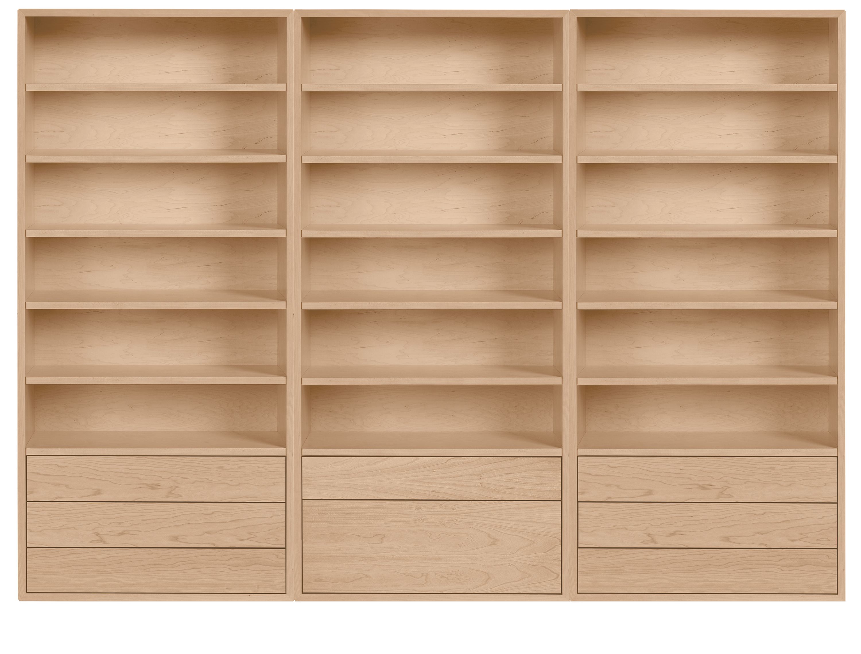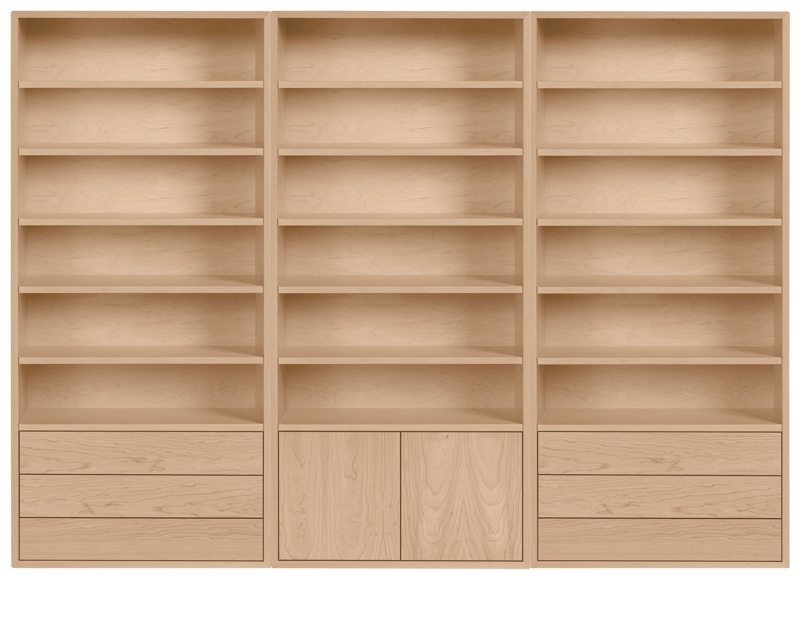 - Includes: (2) 36w 14d 77h Bookcases; (1) 36w 14d 77h three-drawer Bookcase; anti-tip safety hardware