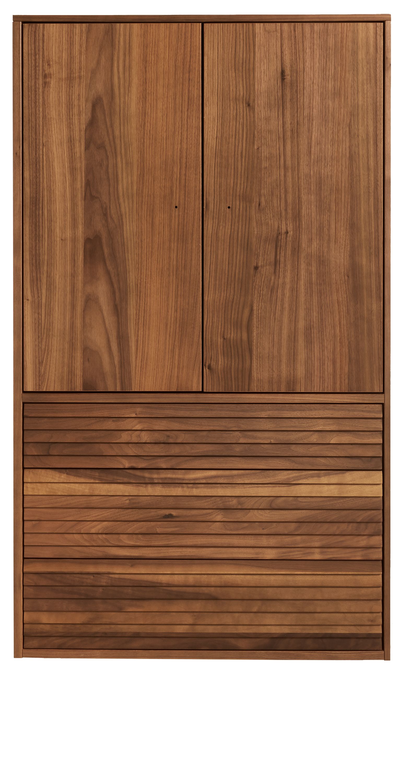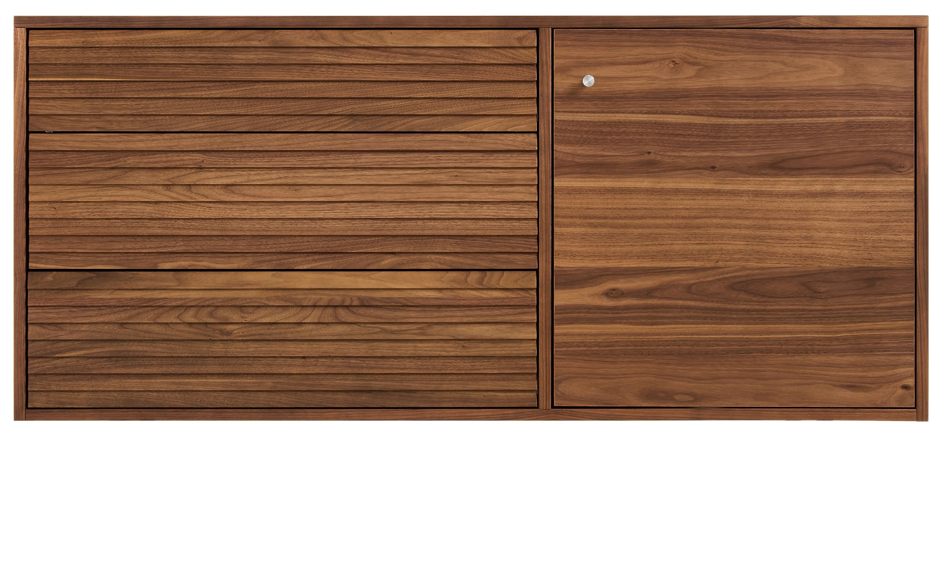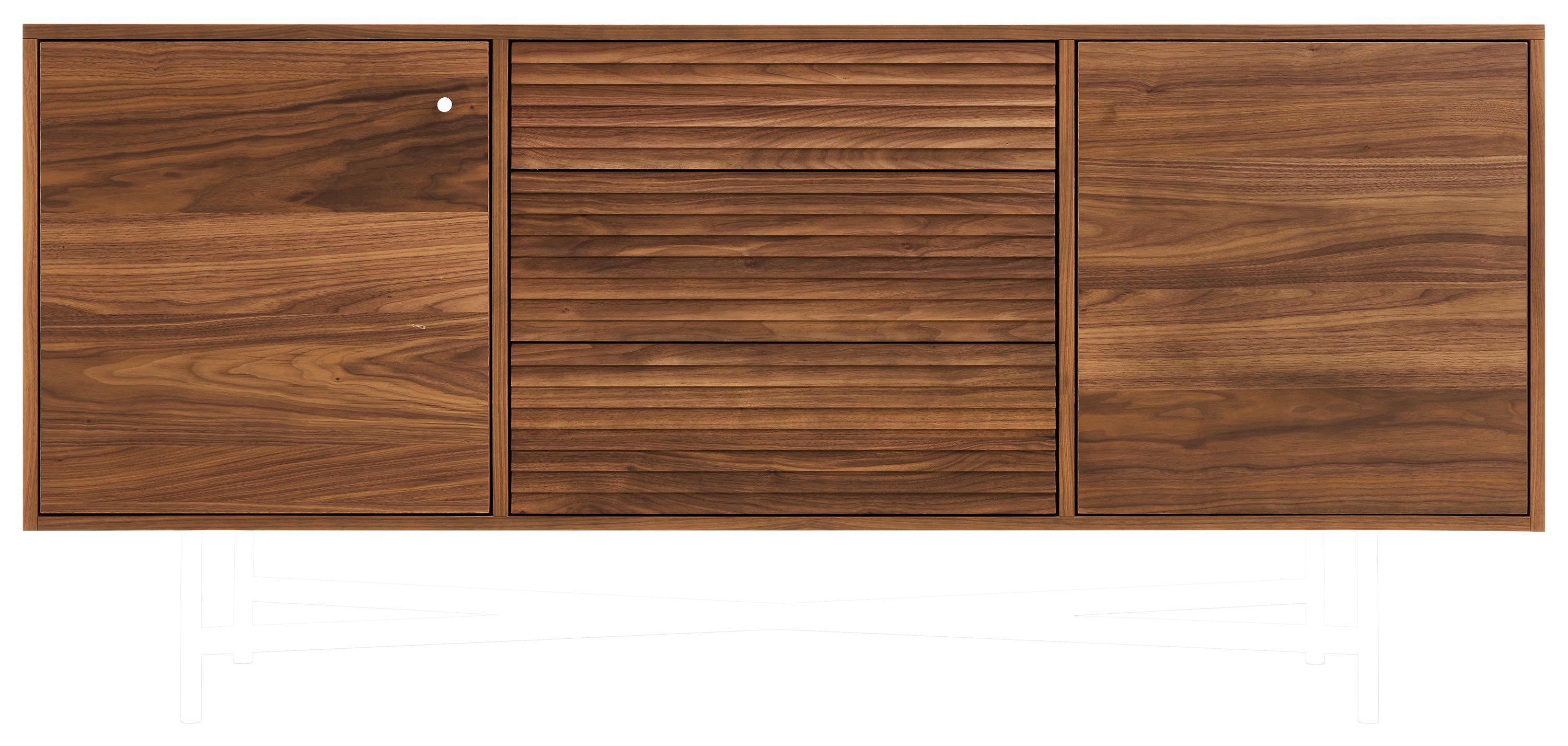Make a statement with the Adrian storage cabinet. Louvered drawers crafted from a solid wood panel add unexpected texture and feature push-to-open functionality, while a sleek, soft-close door offers striking contrast. The cabinet is crafted entirely of domestically sourced veneer and sits atop a unique X-base steel frame with rounded tube legs that play back to the soft shape of the hardware. Beautiful and extremely well crafted of U.S. and imported materials, Adrian is a unique testament to modern design and American craftsmanship.