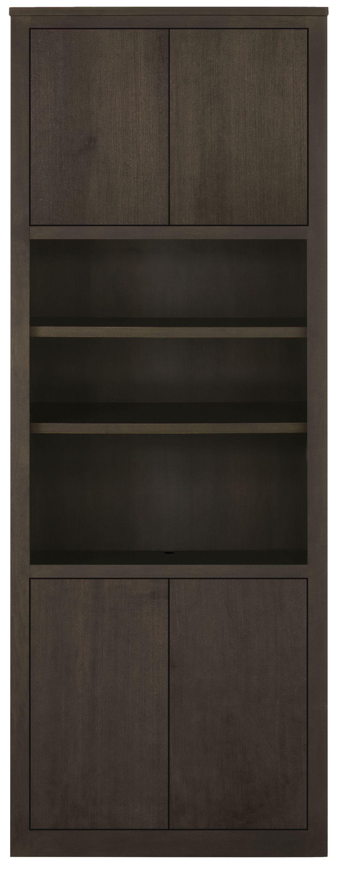 Create a functional focal point by using multiple bookcases. Alternating doors with open shelves adds interest.