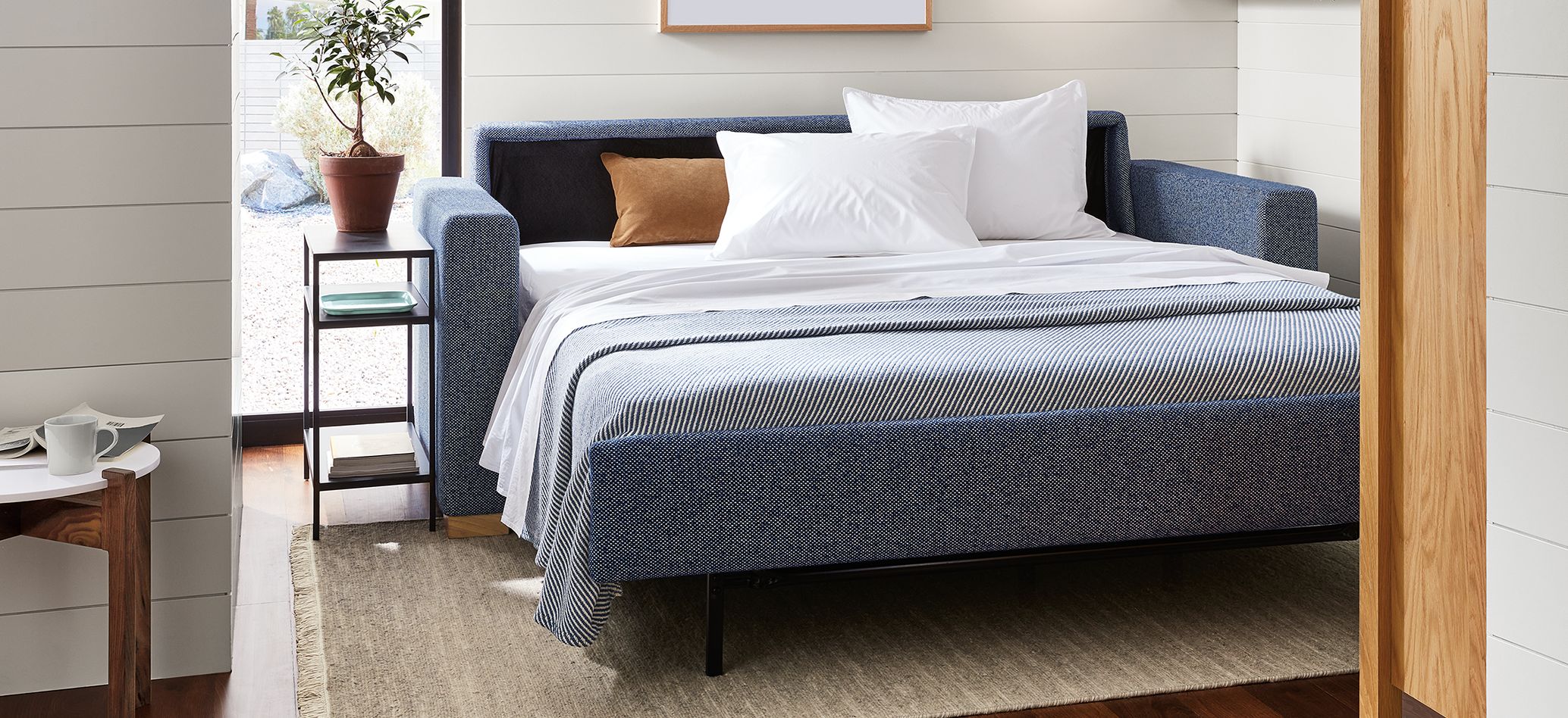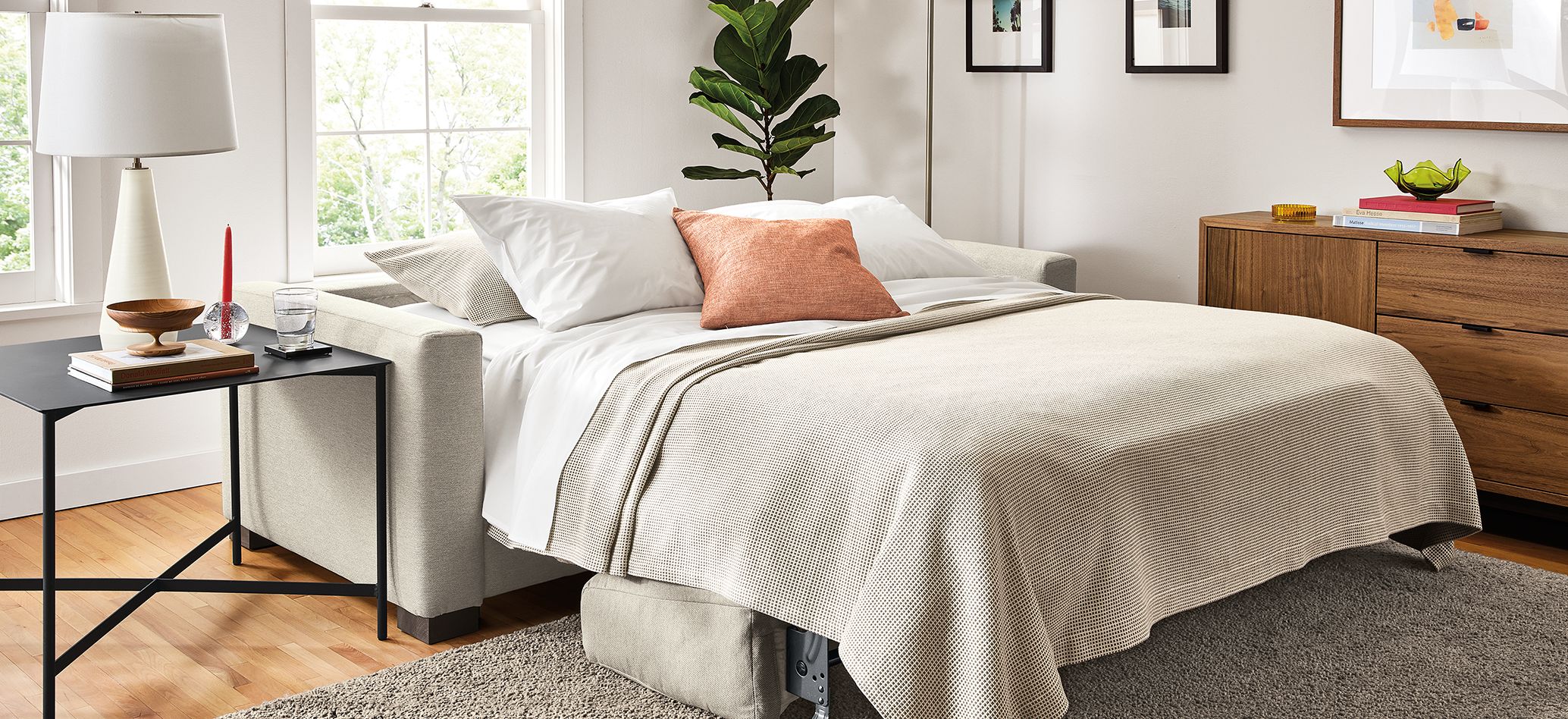 A modern sleeper sofa with a trundle that rolls out and pops up.