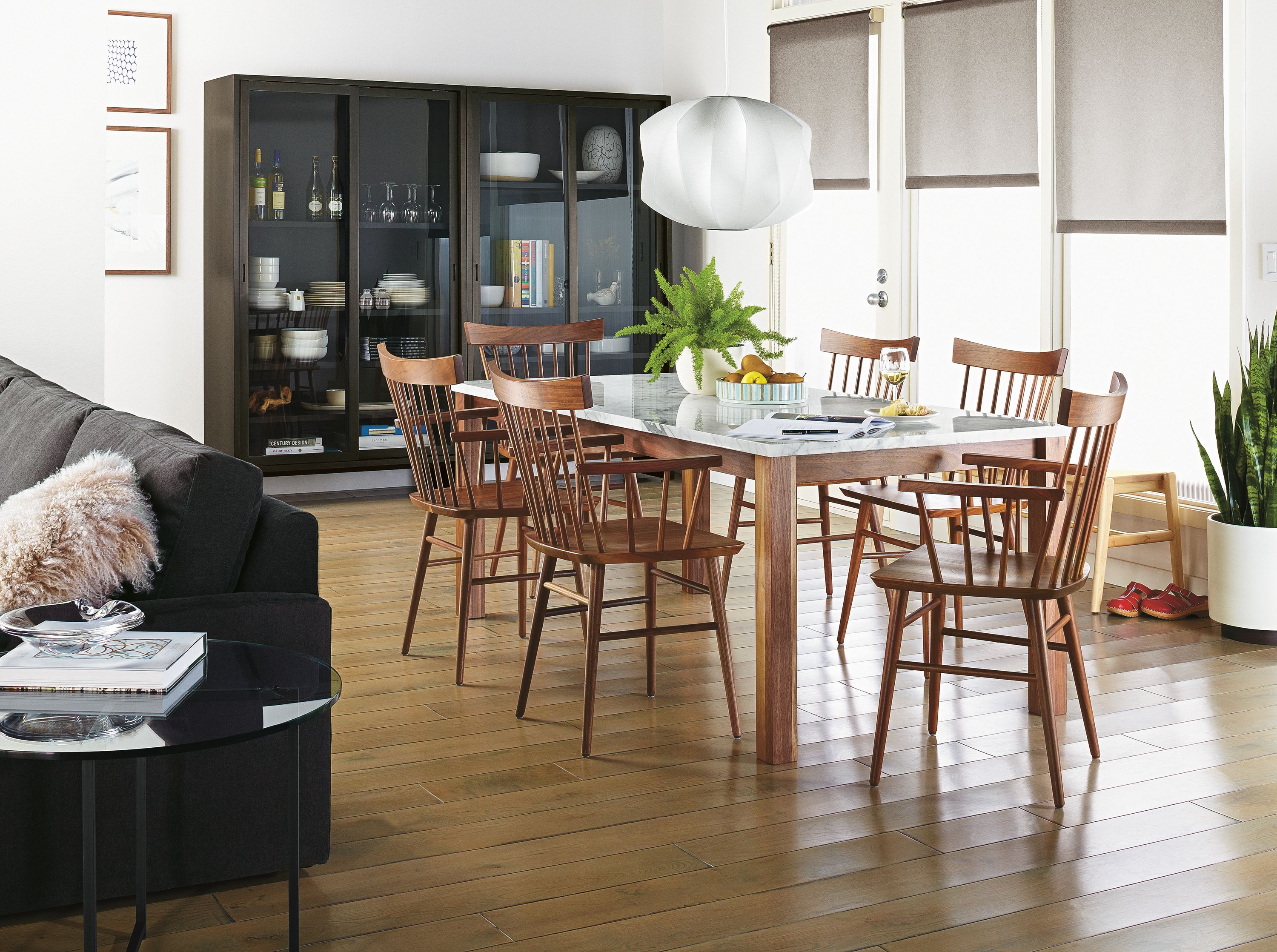 A striking mix of natural materials, Linden offers Arts & Crafts style with modern sensibility. Your choice of durable stone top options rests on a solid wood base and the sturdy legs are set at the corners to maximize room for chairs. This modern dining table is a good choice for everyday dining and is equally at home in more formal settings.