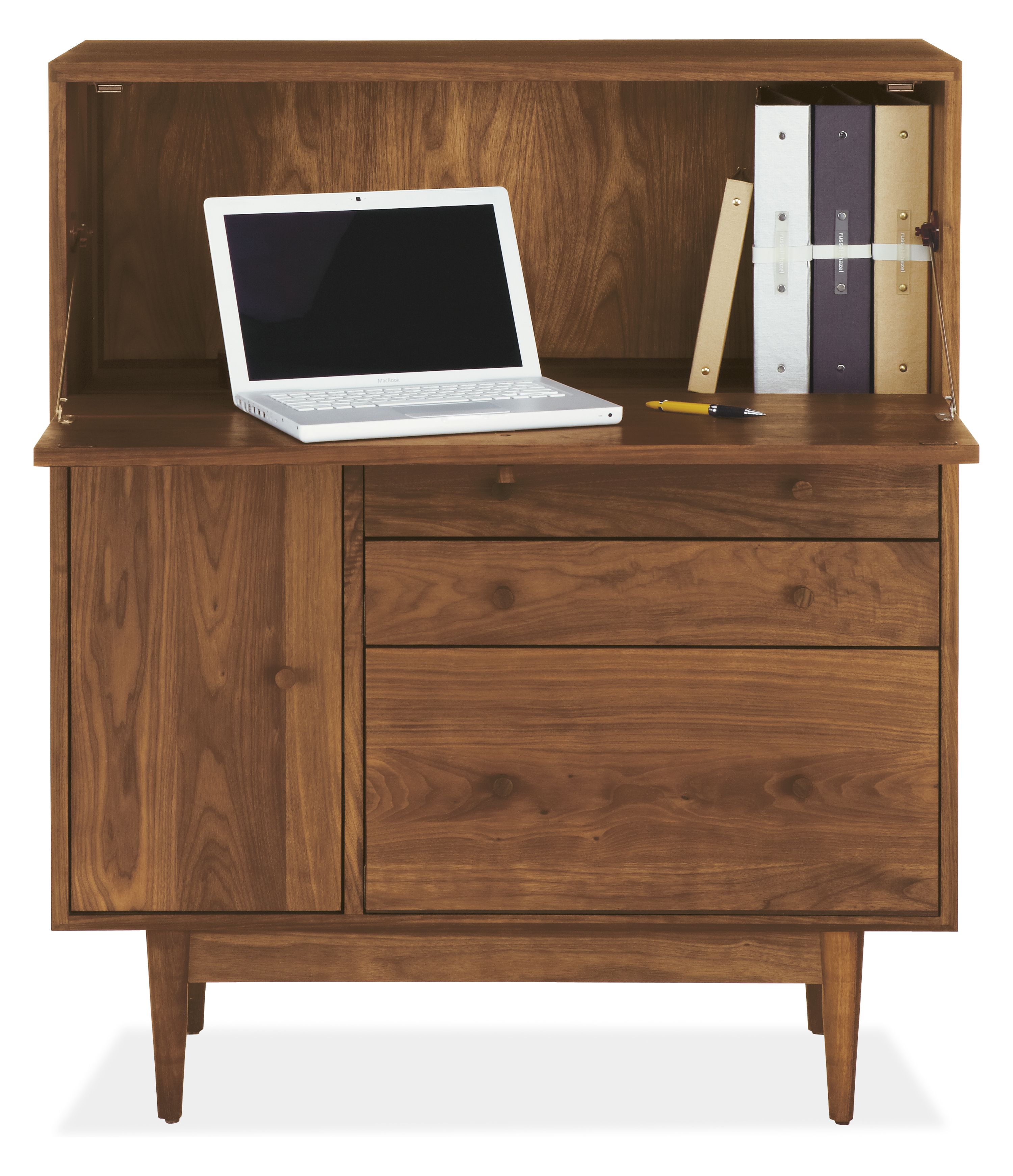 Mid-century details like solid wood, turned and tapered legs and beveled edges lend an air of refinement to the Grove office cabinet. Crafted by Pennsylvania woodworkers, Grove features an oil-and-wax finish that enhances the natural grain pattern of every panel of its solid wood construction.