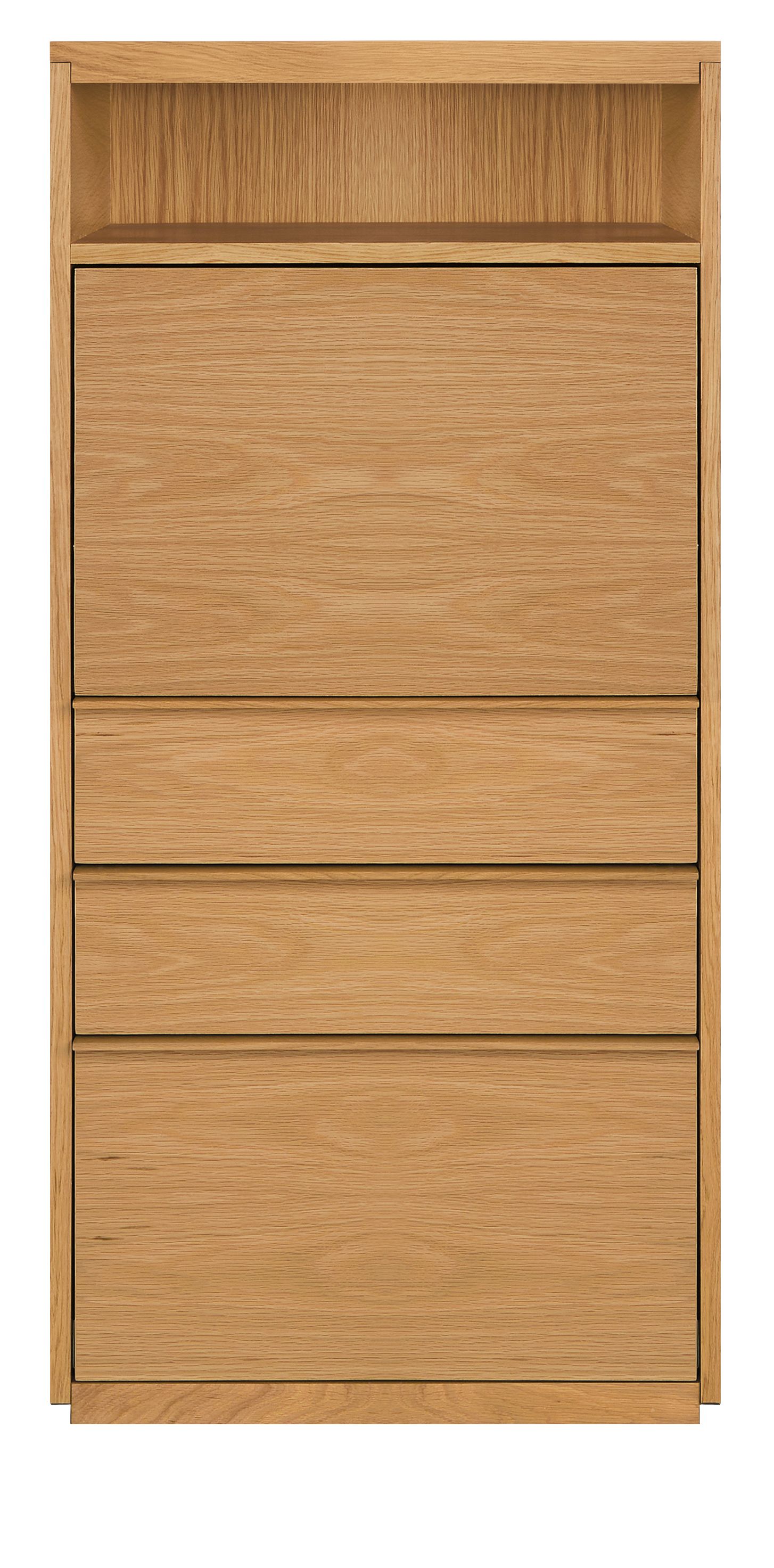 Push-to-open door and drop-down work surface; two drawers and file drawer