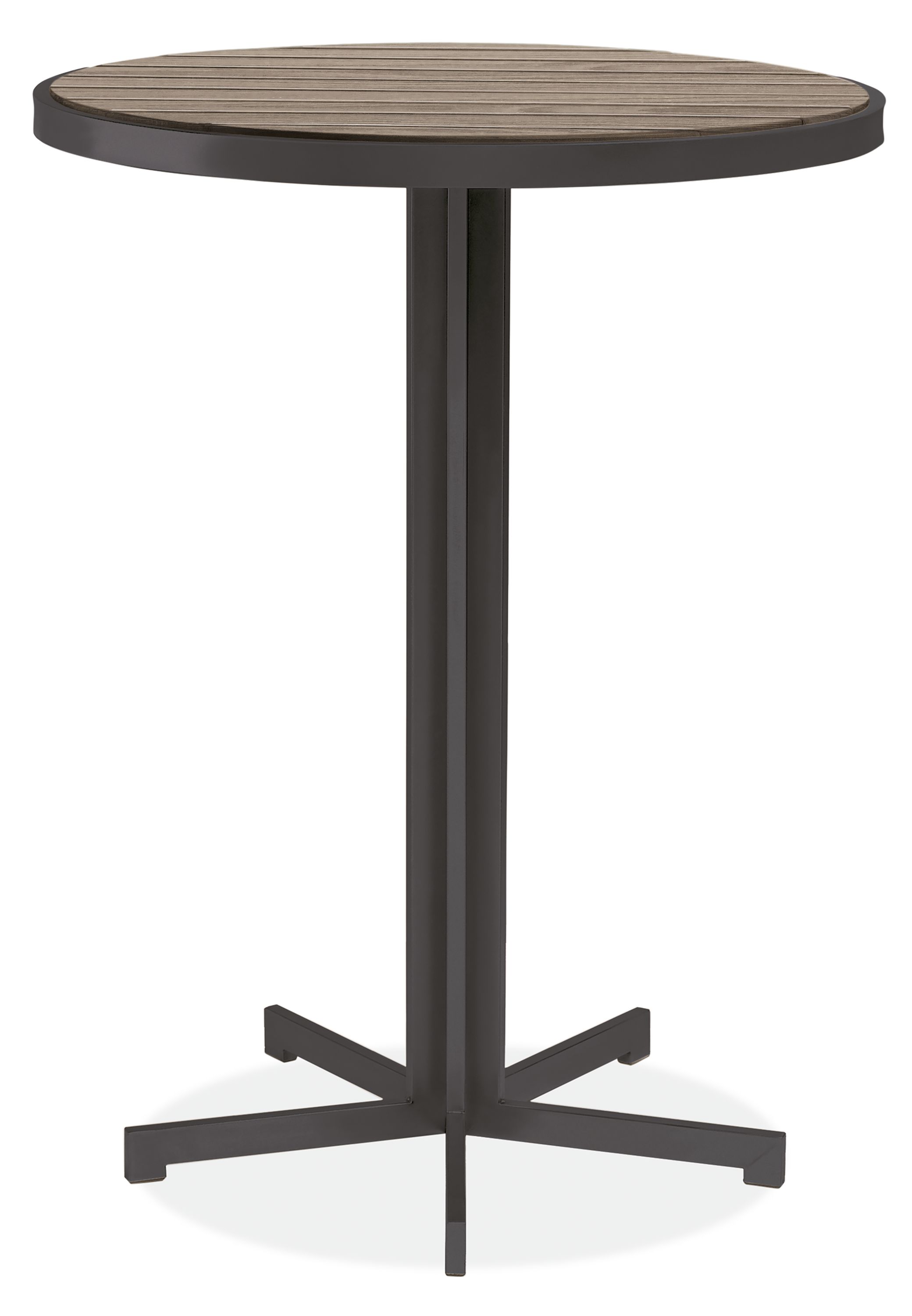 Outdoor space with Montego round bar table and 2 bar stools in aged thermally modified oak and graphite