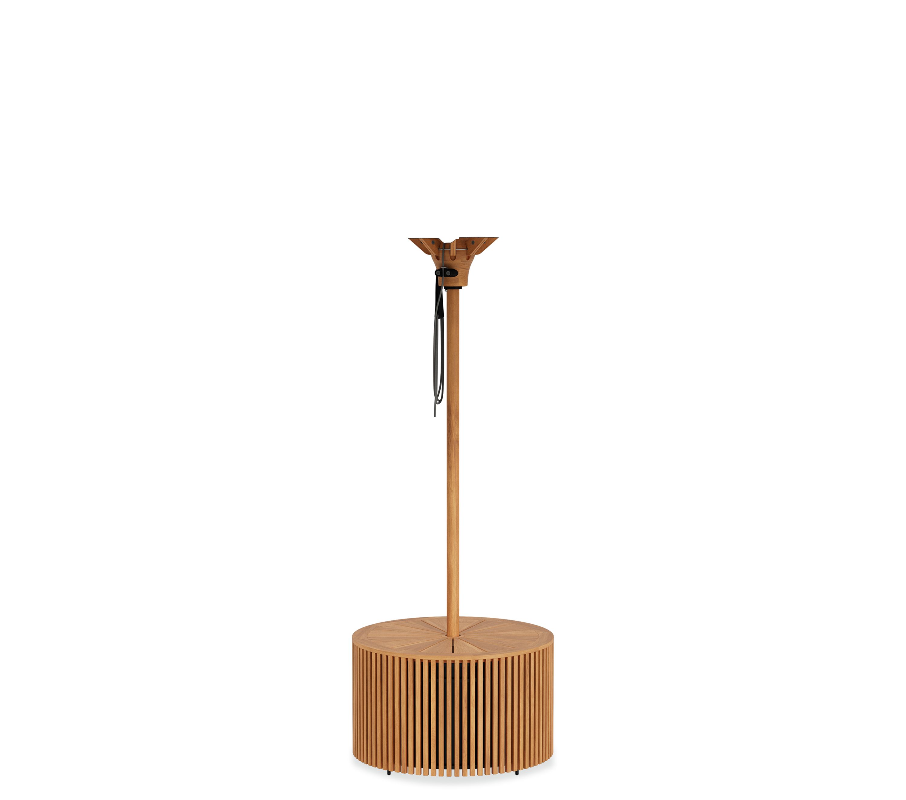Poolside area with Banda 10-foot round patio umbrella with side table in teak heartwood and halo white fabric.