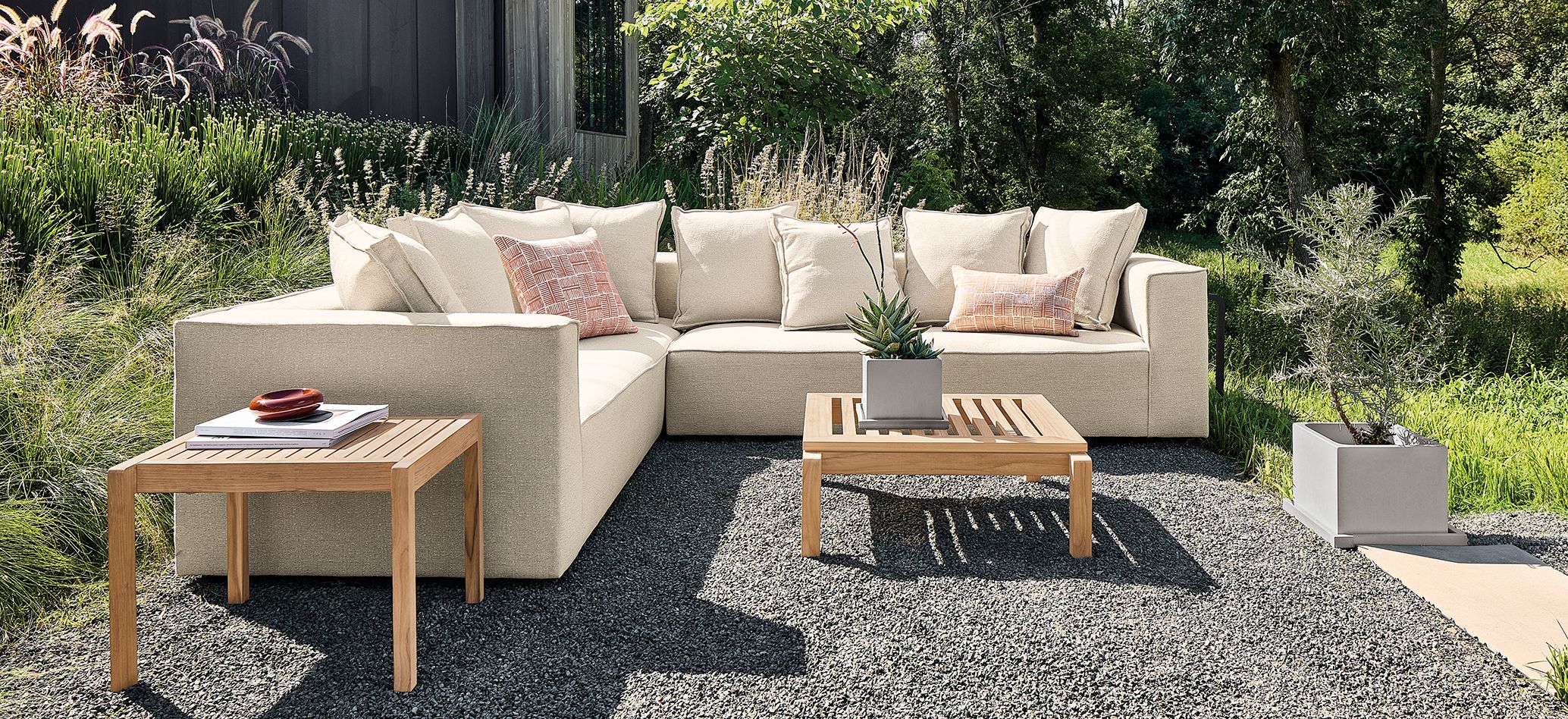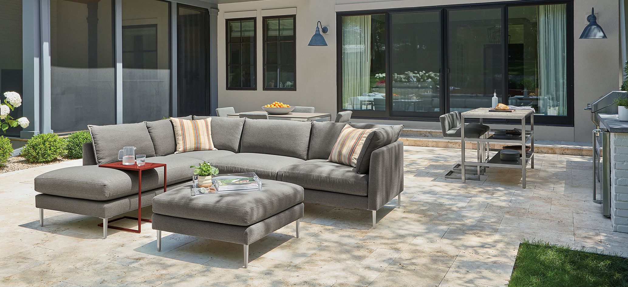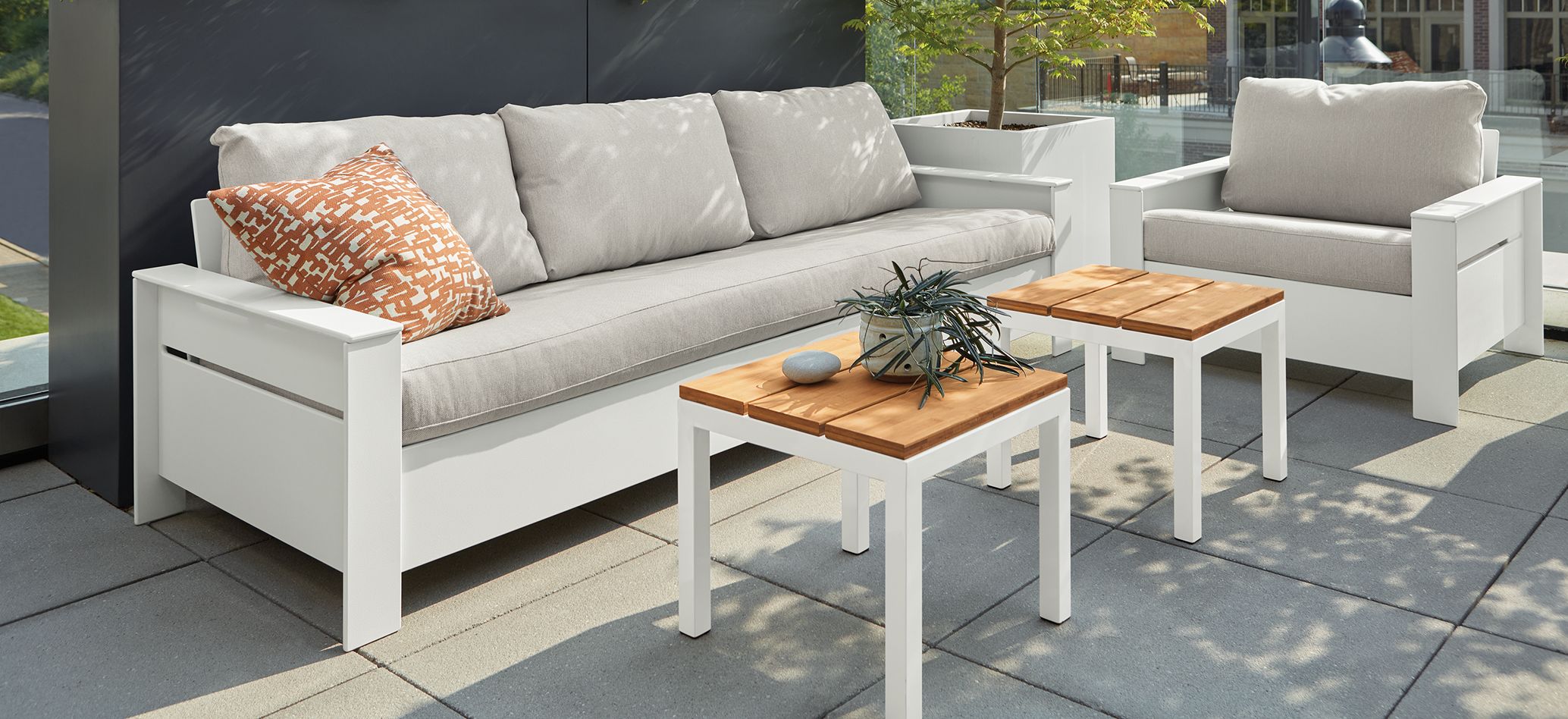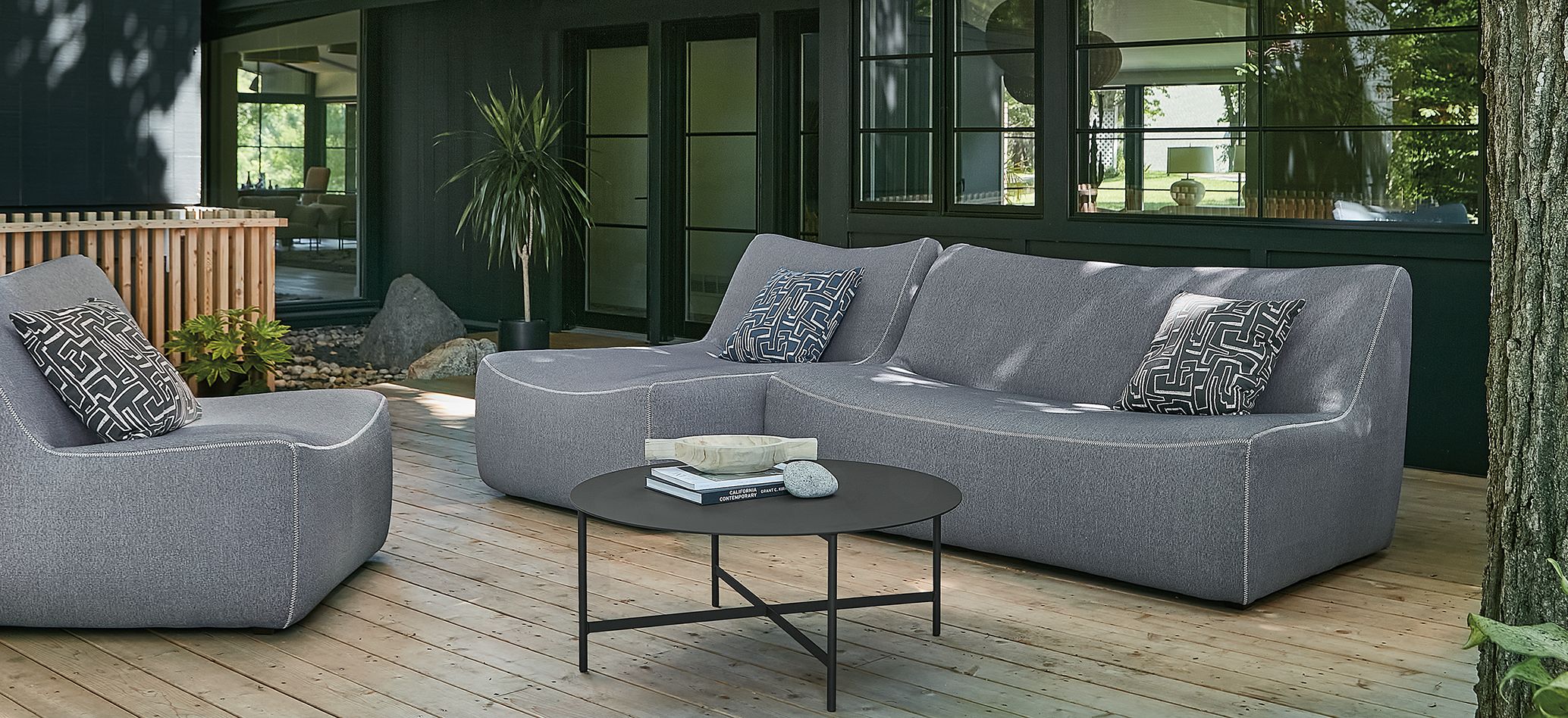 Consider furniture with an airy design to play off the sofa’s wide cushions.
