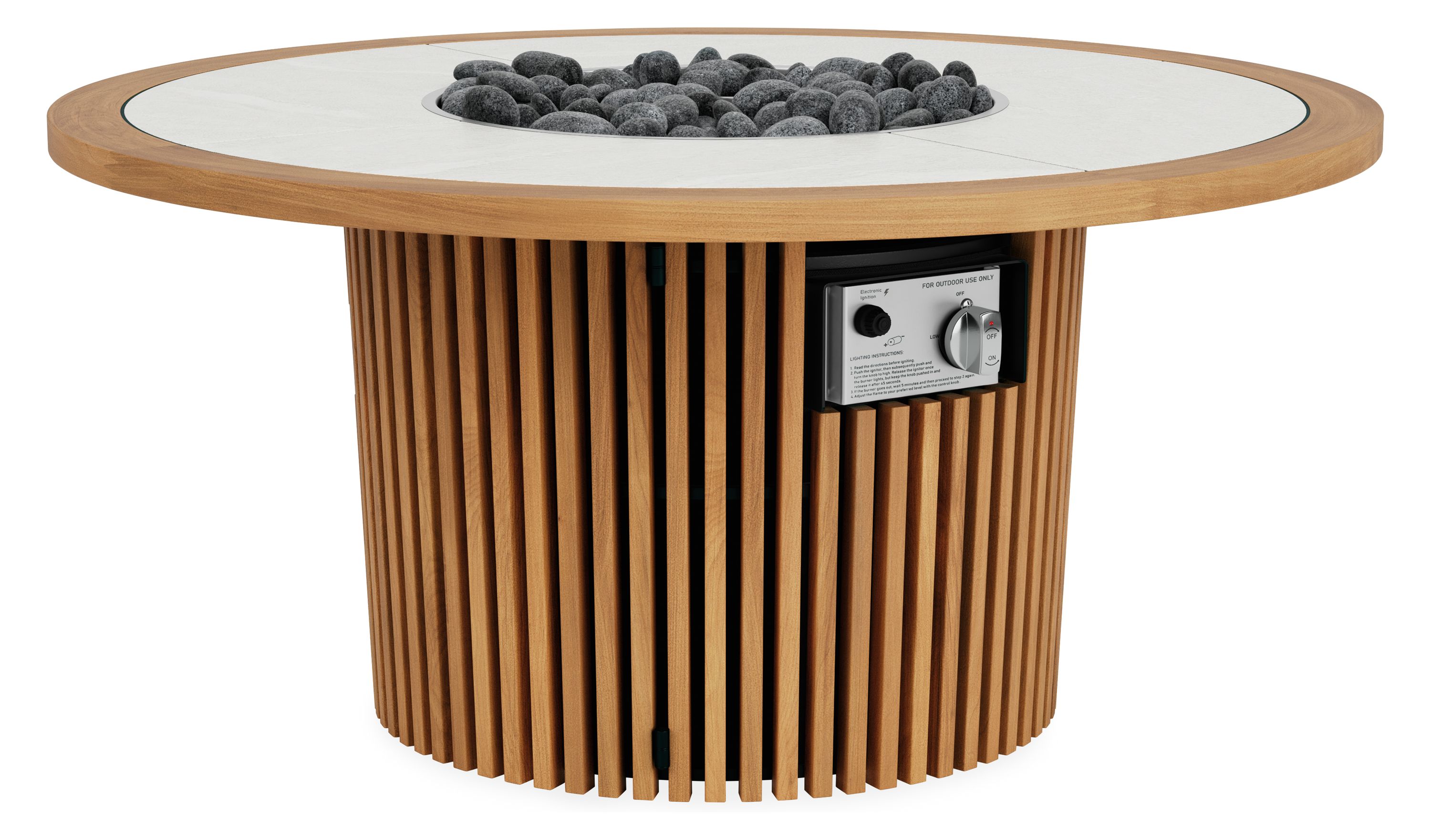 - Considerations: only use outdoors in well-ventilated spaces; only use 20-pound propane tank designed to operate in vertical position (not included); burn time varies based on burner setting; wait to place lid on table until lava rocks are cool