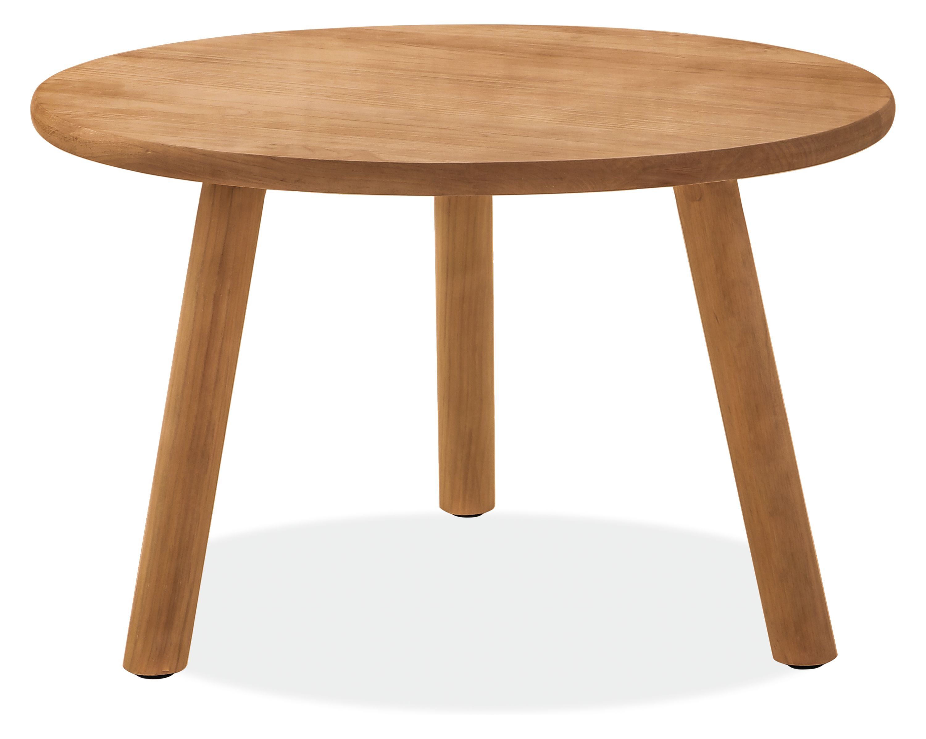 These modern round outdoor coffee tables are made from sustainably sourced, solid teak heartwood, a material with inherent outdoor durability that infuses the beauty of natural wood into your space. Over time, teak naturally patinas to a silver color. The different table sizes can fit into a nesting arrangement where their tops slightly overlap.