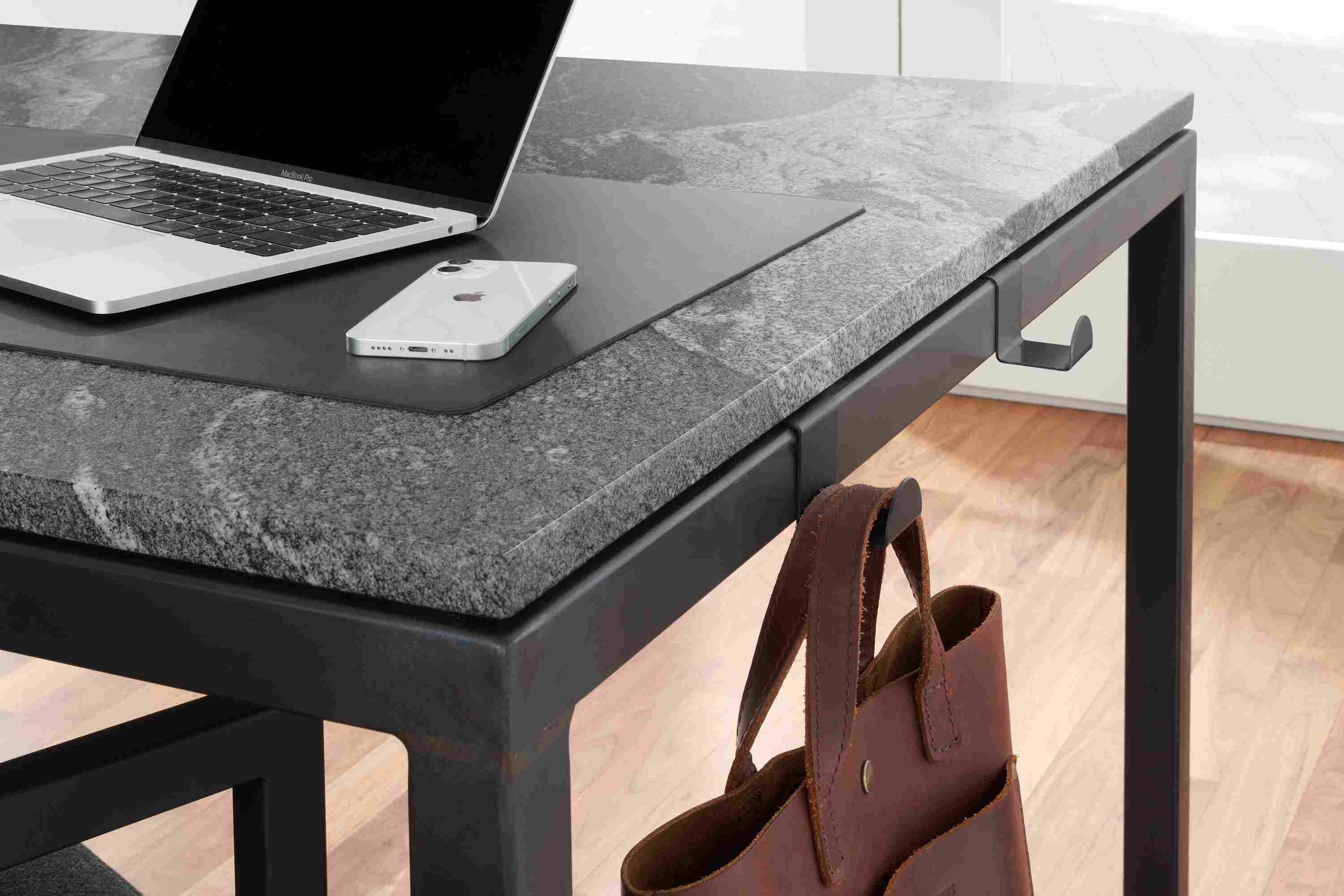 This modern powder-coated steel desk hook works perfectly with our steel outdoor table collections. Lift your table’s top, then place the hook where you wish and use it for storing cords, coats, bags and more.