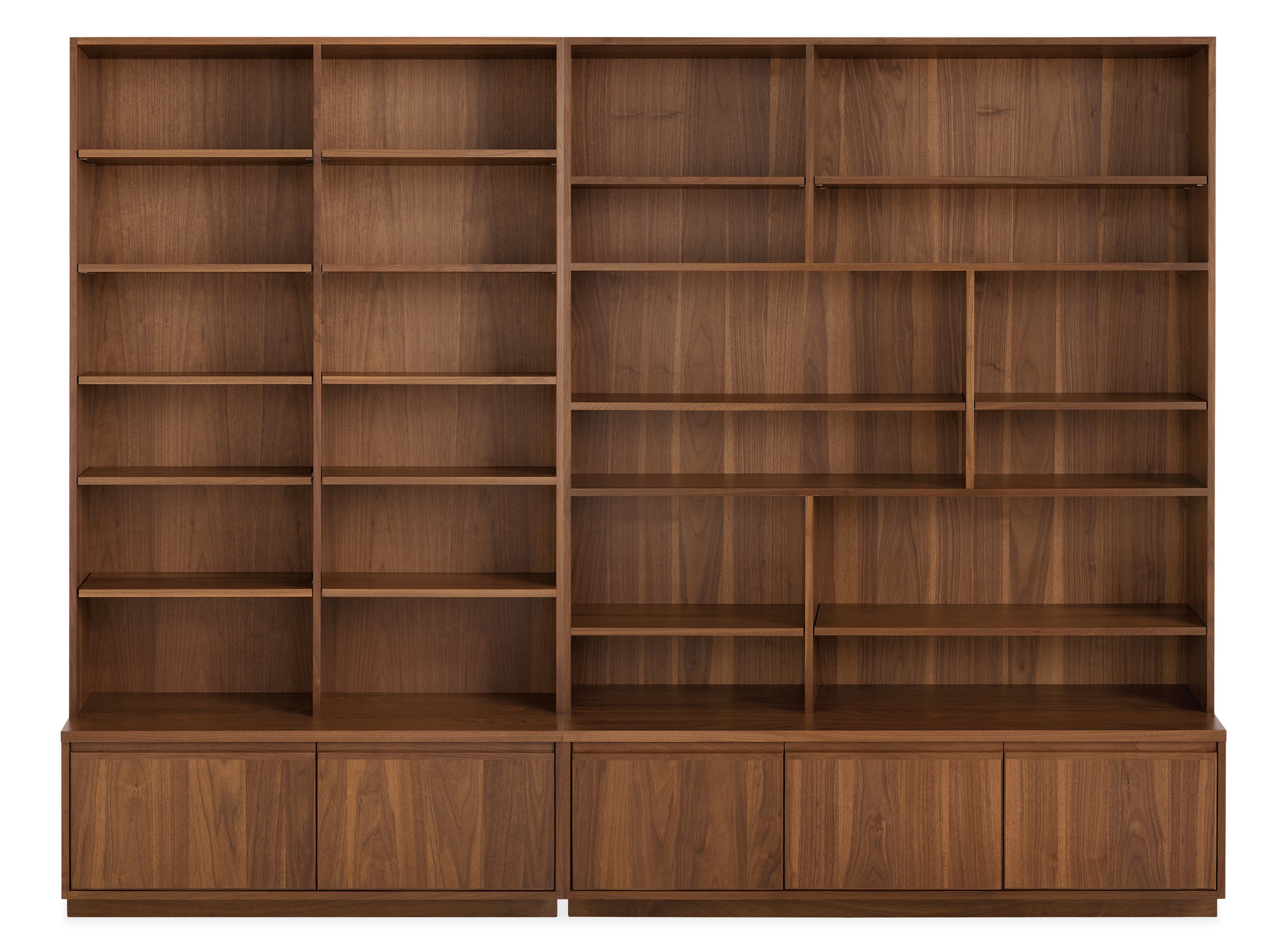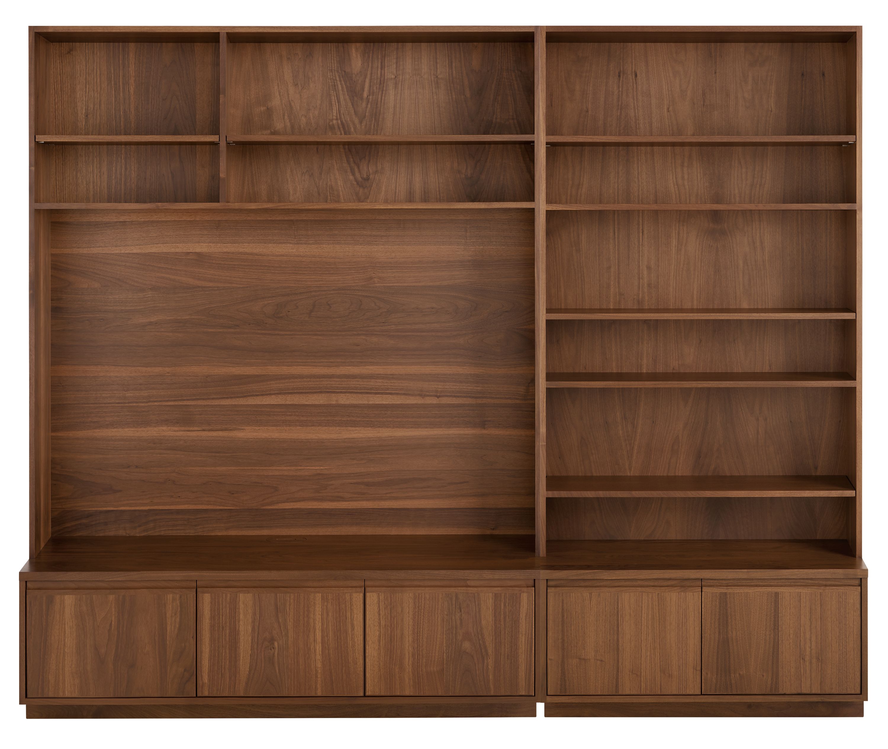 Sleek modern design highlighted in a thin silhouette gives you endless storage options with our Keaton wall unit. Perfect to place in a living room, entryway, bedroom or office, Keaton's clean, architectural lines give this bookcase the feel of a built-in no matter where you place it. Each piece is handcrafted in a northern Wisconsin woodworking shop, and it includes hardware to securely attach to the wall.